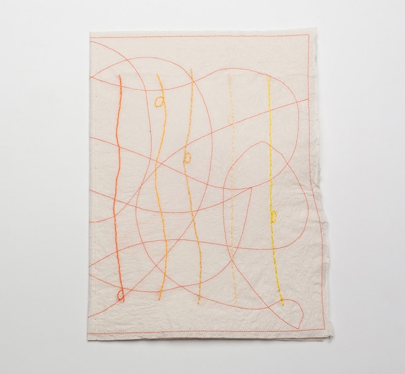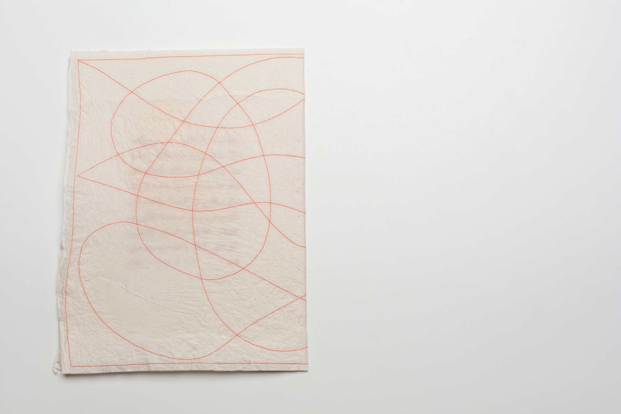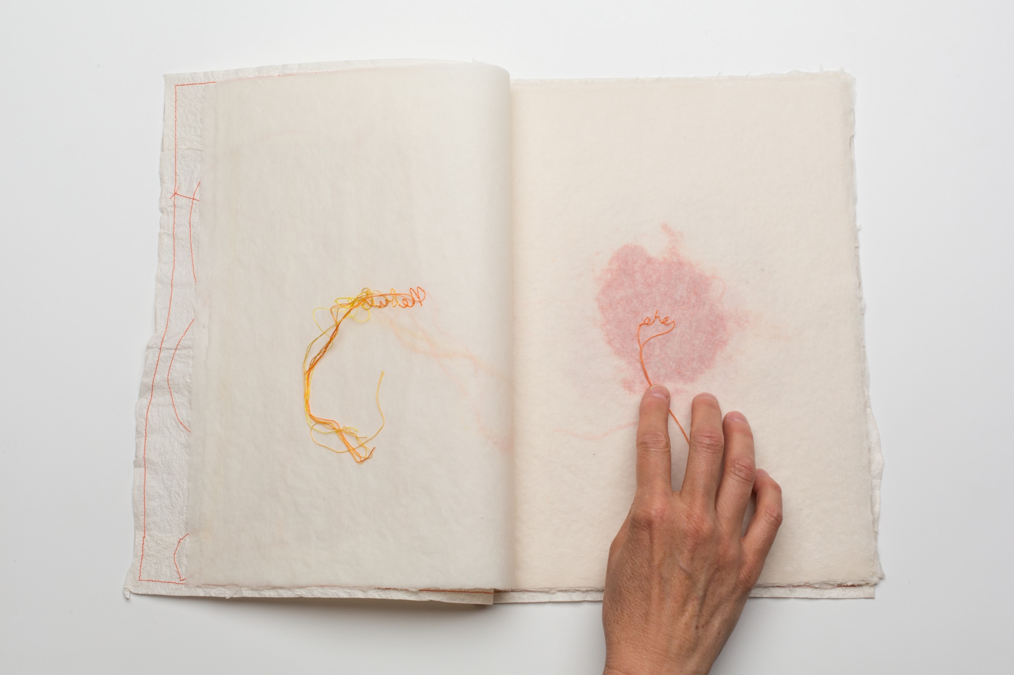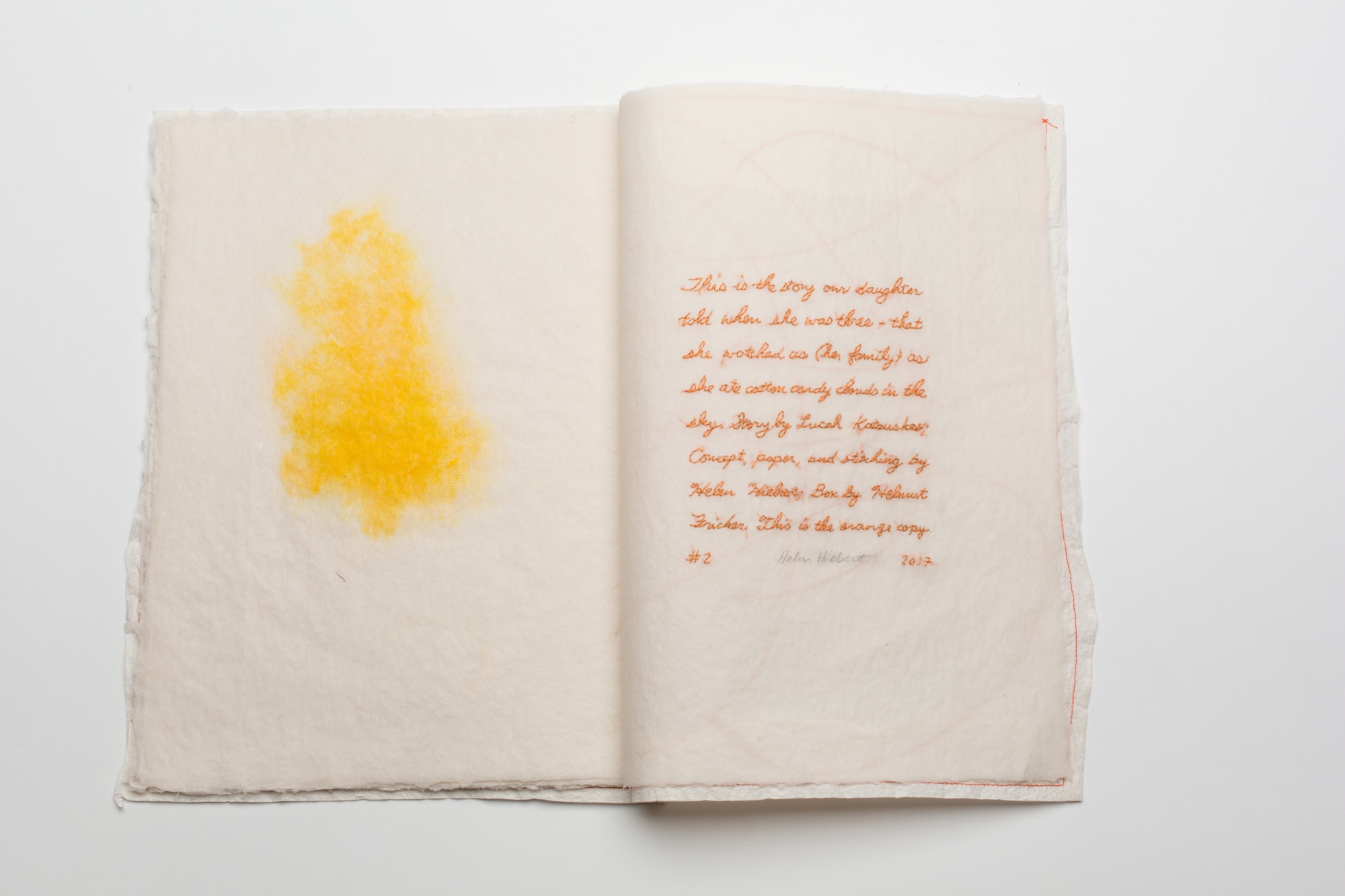 This book illustrates a story our daughter told us when she was three years old, that she watched us (her family) as she ate cotton candy in the sky. One word is stitched on each blank page that sits above another page with a pulp painted cloud on it. The text reads: she was eating clouds observing earth below awaiting her descent and is visible to varying degrees as the pages are turned.