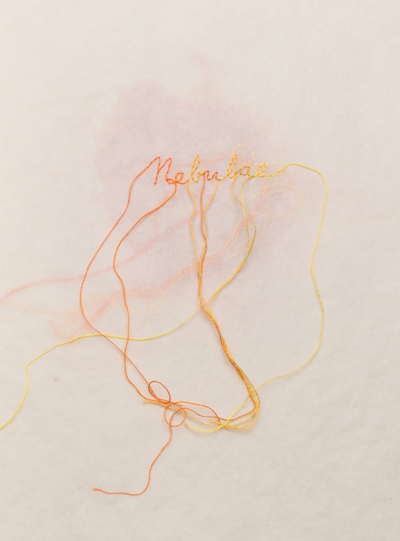 I found it so amazing – that my child who had just learned to talk had grasped one of the eternal wonders: where do we come from? My interpretation of her story appears and disappears as the pages are turned and the threads move through clouds in a range of the spectrum.