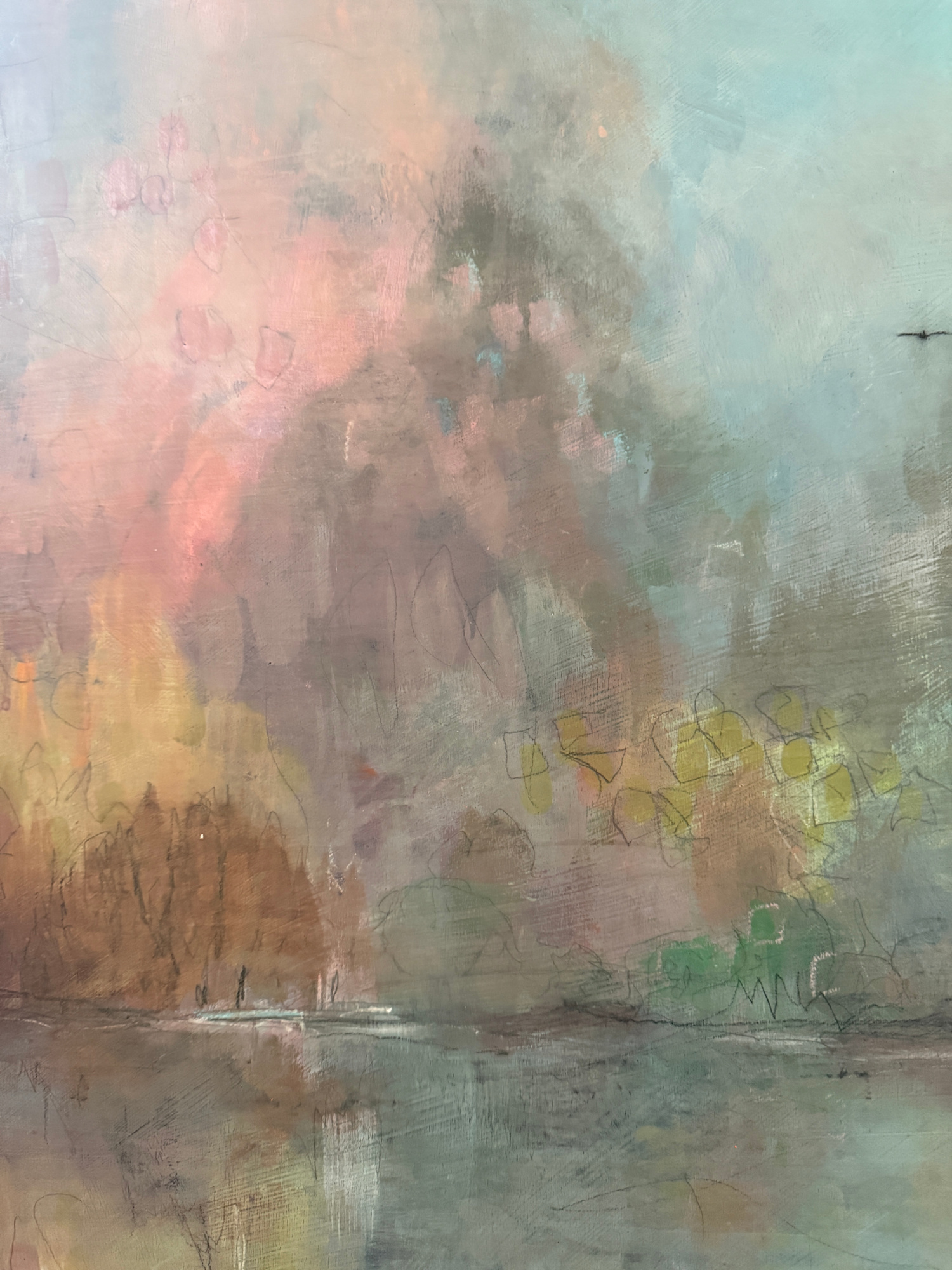 Mixed Media : Encaustic Wax, Acrylic & Oil on Wood, Solid Oak Frame
