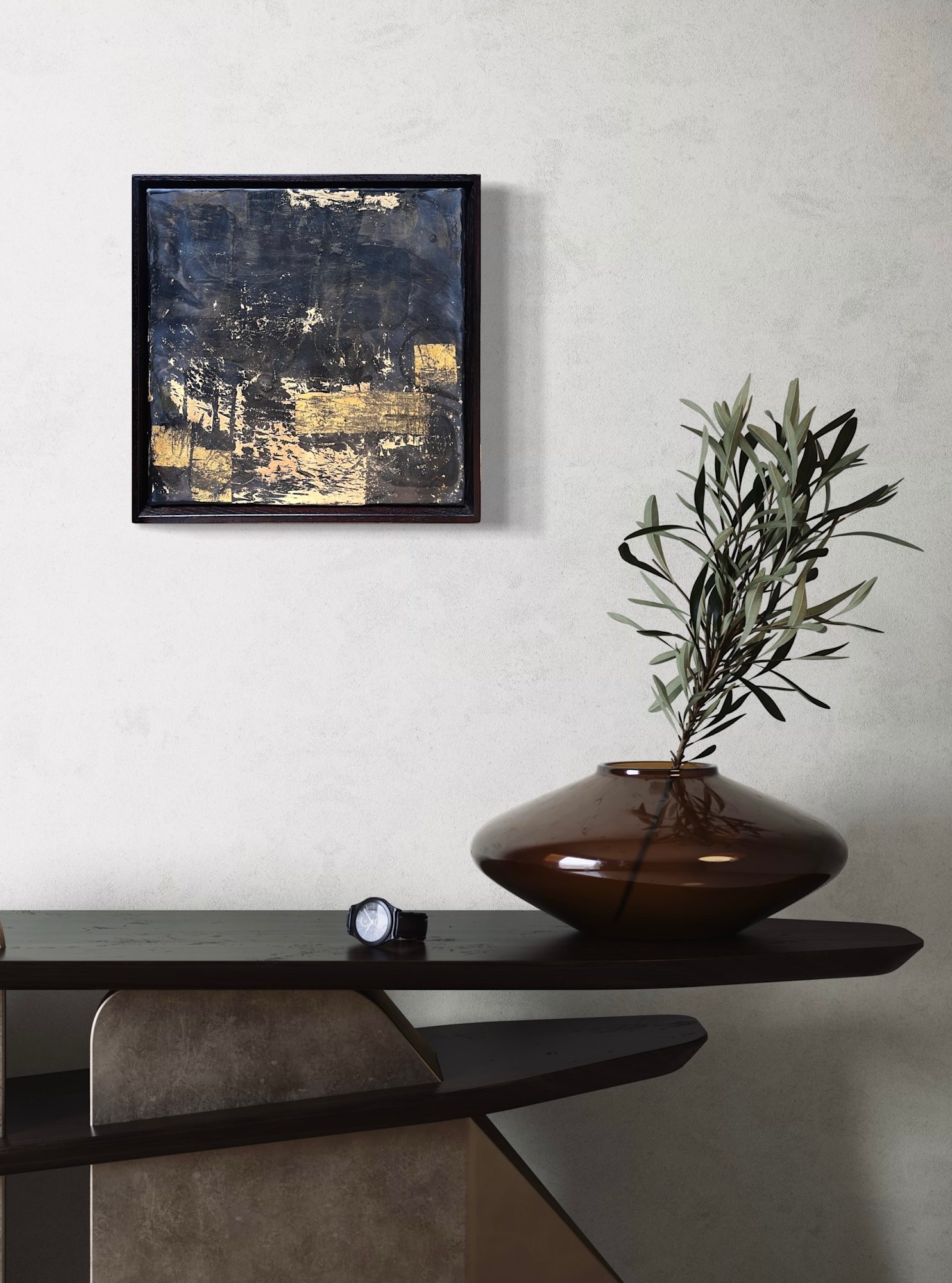 Mixed Media : Solid Encaustic Wax, 24k Gold, Ink, Pigment on Wood, Solid Oak Frame