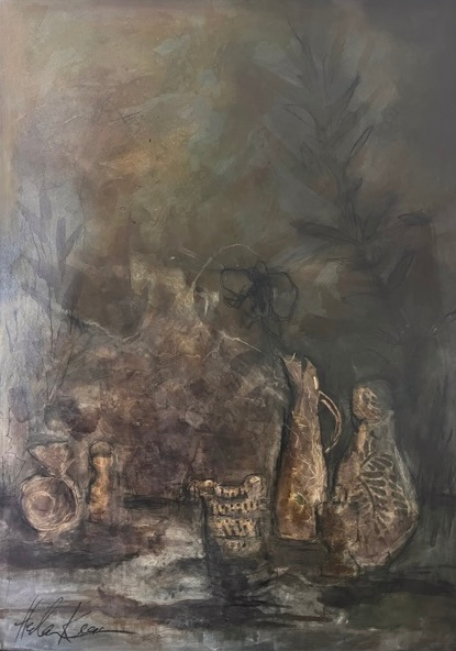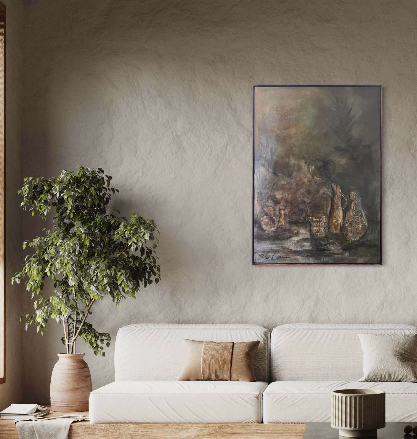 Mixed Media : Encaustic Wax, Acrylic, Oil, Harakeke (Flax), Collage on Wood, Solid Oak Frame