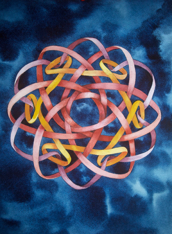 his watercolor is one of a recent series of watercolors that I painted based on 'Knot Theory,' a branch of mathematics that does not actually measure. That is my kind of mathematics!. Borromean Knots are made up of three intersecting ribbons or cords that are no longer connected when one of the three are removed.
