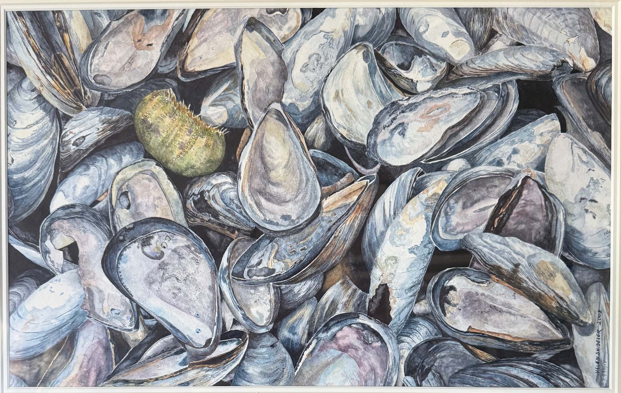 This watercolor started with a handful of open mussel shells scattered along the tide line. The kind you step over without thinking—blue-black, curved like question marks, glinting slightly in the sun. Some still hinged together, others flared wide, empty.