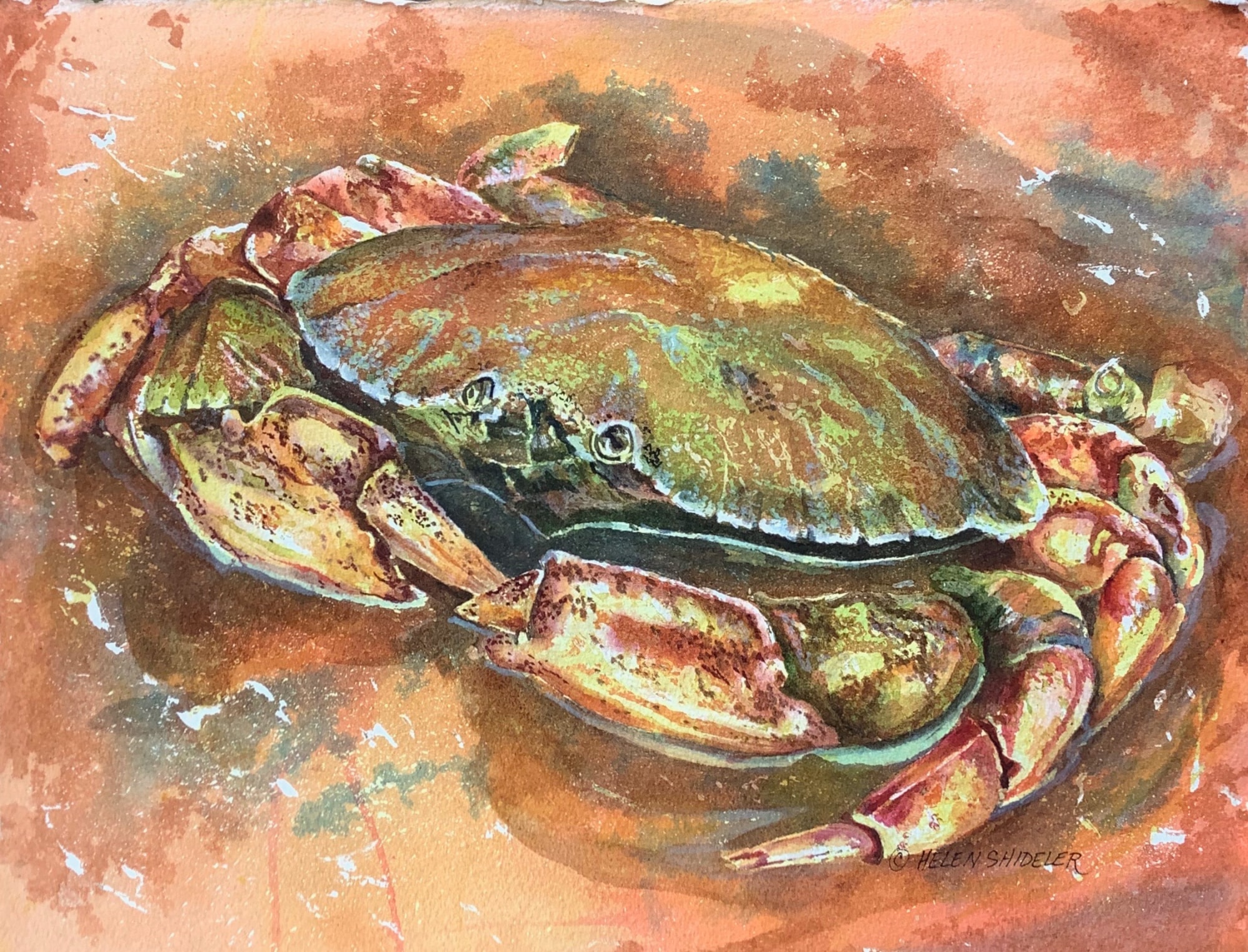 This is a 1/4 sheet poured watercolour of a crab. I experimented quite a bit with this piece in that i wet specific areas the paper with PEI beach sand and “fed” it colour. Other than it sticking to the masking compound and making it a bit challenging to work with, I really like the effect.
