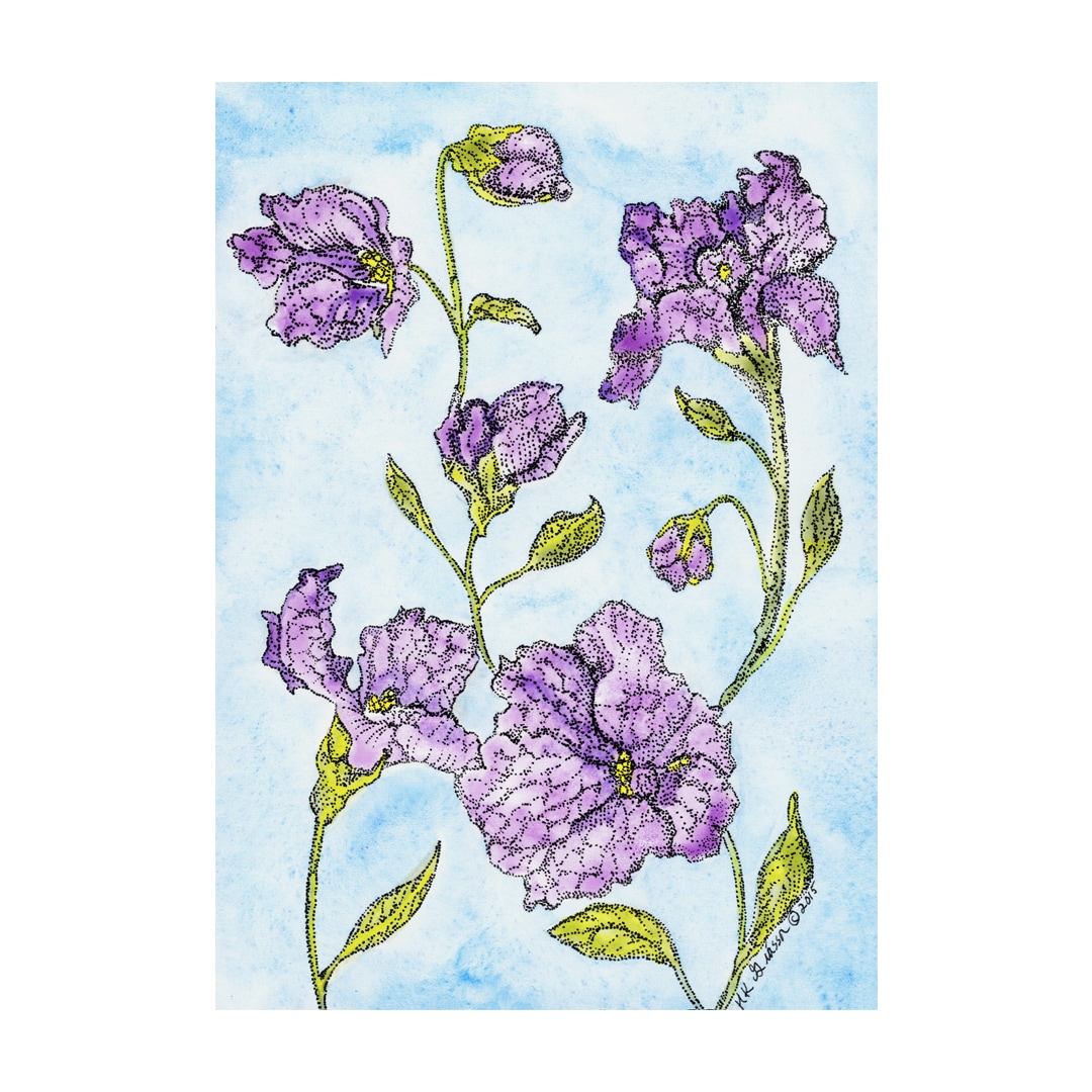 Blushing Blossoms is an original watercolor painting depicting African Violet buds unfurling against the blue sky.