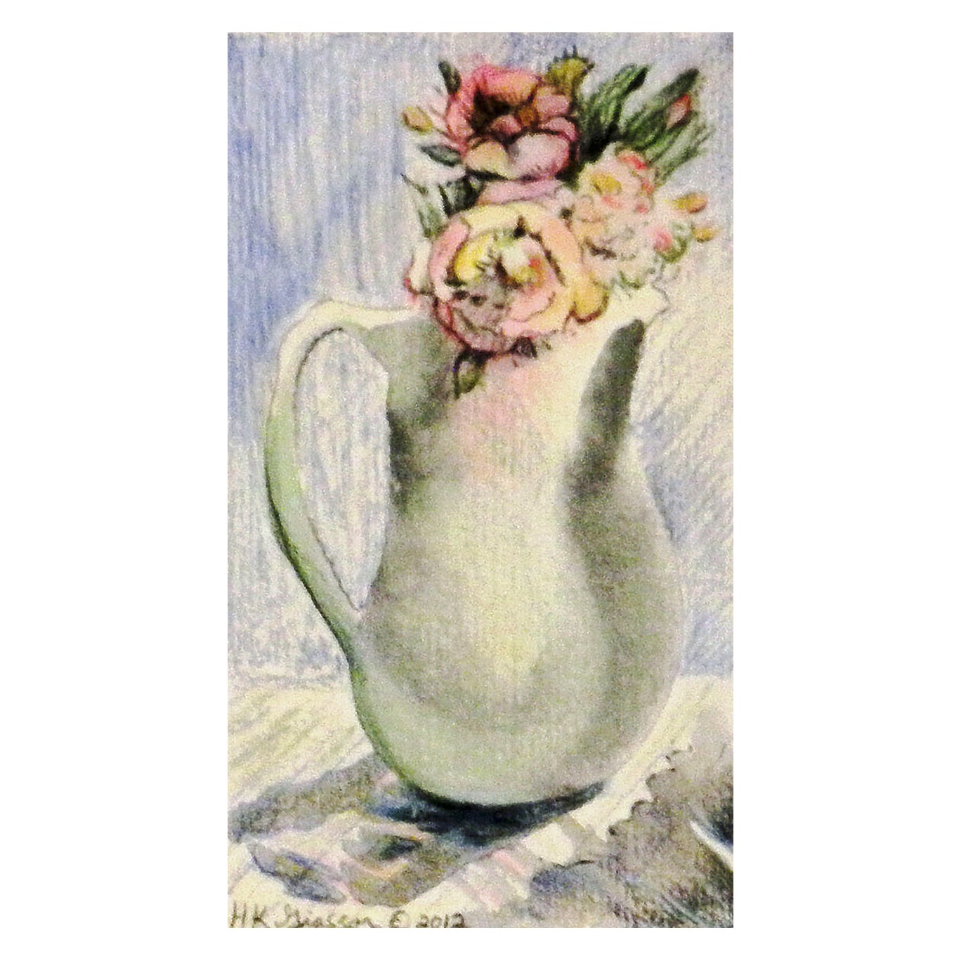 Flower Fiesta is a miniature mixed media of a vintage milk pitcher filled with flowers. Matted to 4 x 6"
