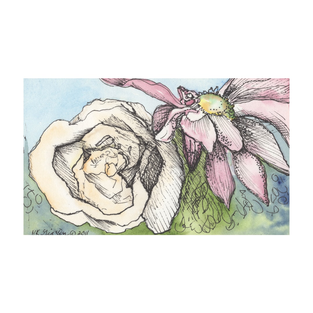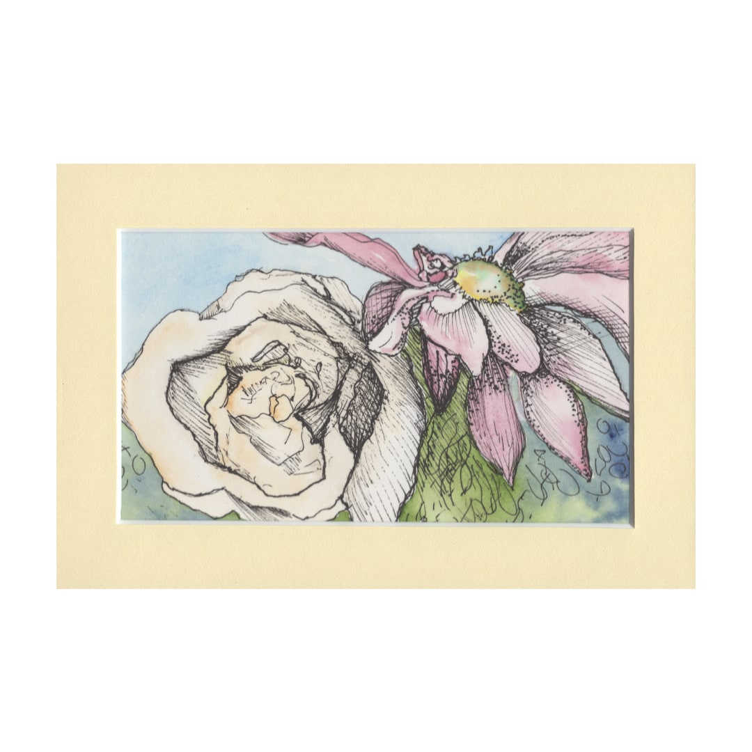 Nestled II Watercolor rose with purple daisy Floral Painting, the Pom Pom Daisy is a great source of nectar for bees and butterflies.