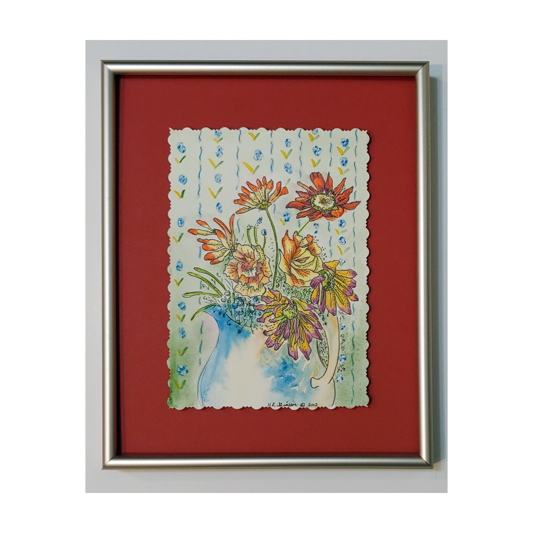 Pitcher Perfect 2 is part of a series a miniature watercolor floral painting with pen and ink touches of a vintage milk pitcher filled with wildflowers against a vintage wall paper inspired background.
