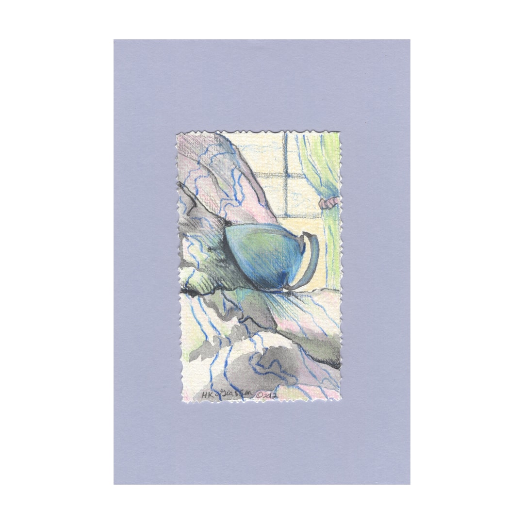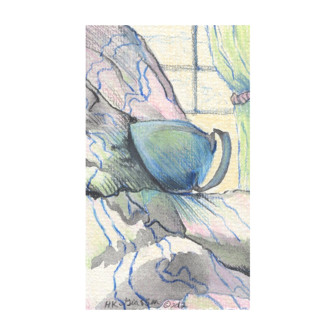 Tea Time 5 is a miniature painting of a blue teacup against a striped cloth.