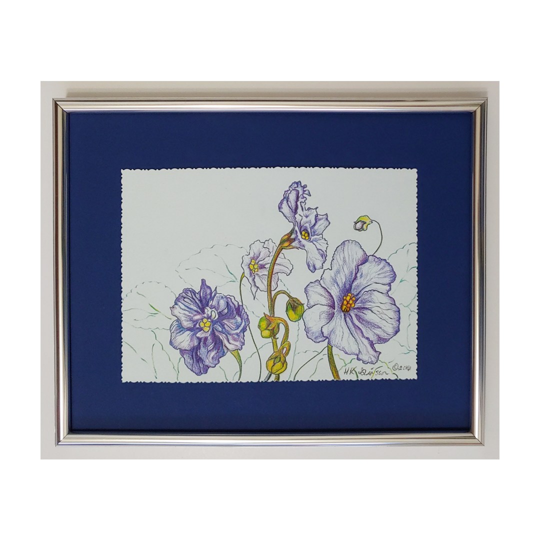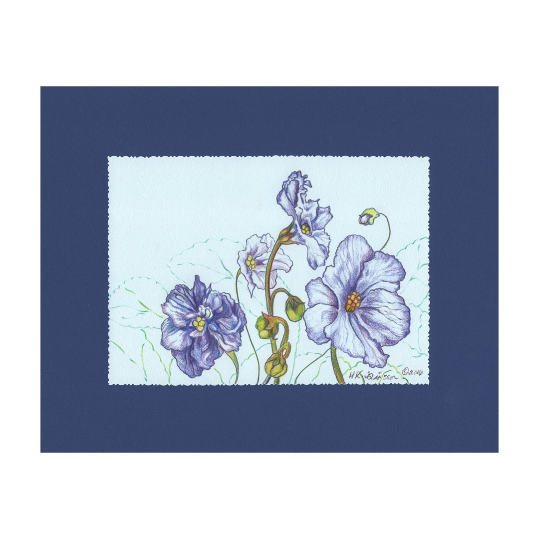 Violet Parade IV is a color pencil drawing of african violet blossoms unfurling.