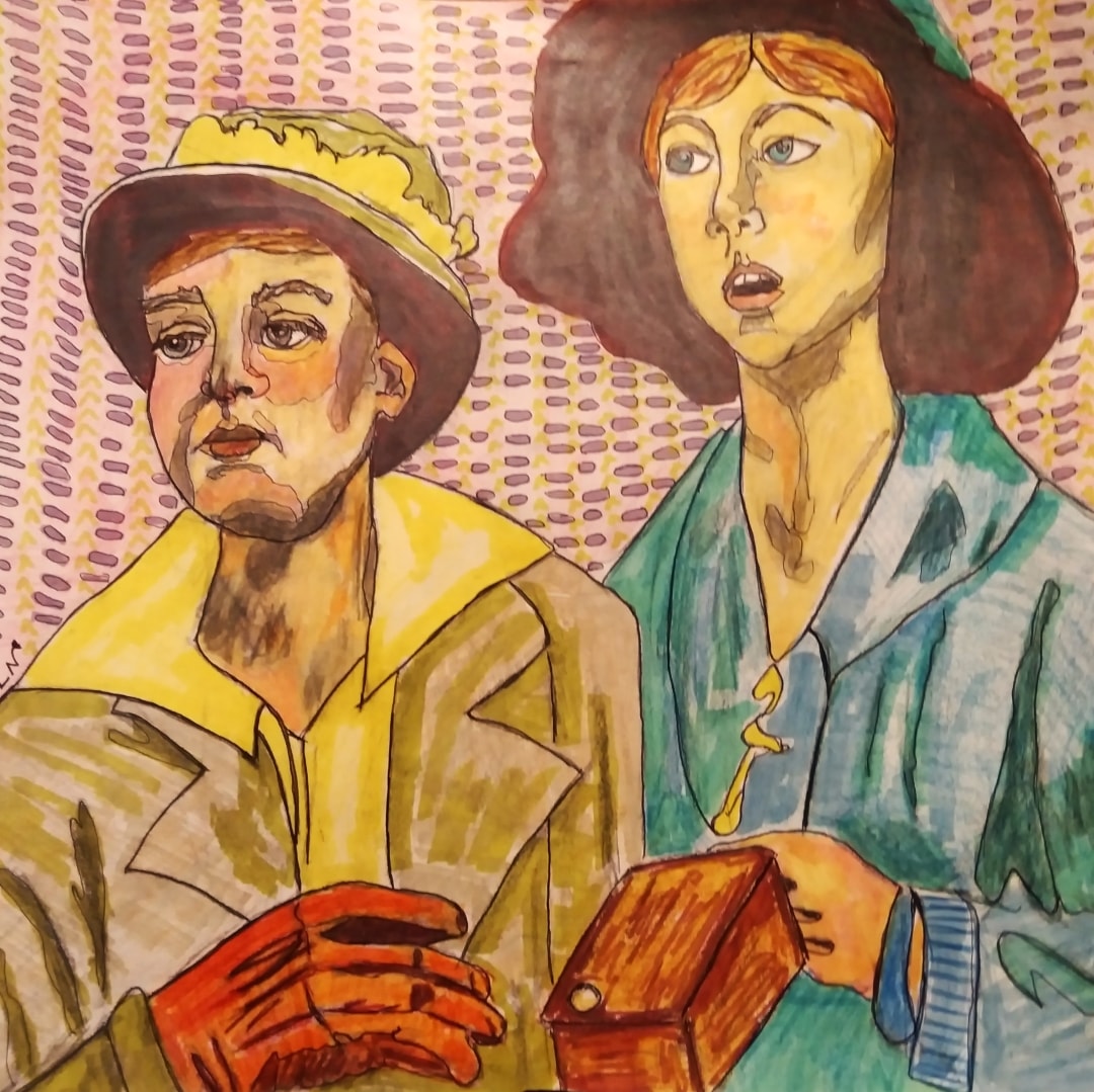 Deux femmes élégamment vêtues sont représentées dans un moment de complicité tranquille, leurs chapeaux et leurs vêtements à la mode évoquant les coutumes sociales et le style féminin des années 1950. La femme en jaune et sa compagne en bleu incarnent le souci de l'apparence et des convenances sociales qui caractérisait cette période. Sur fond de motifs décoratifs, la composition souligne l'importance des réunions sociales, de l'amitié et des rituels de la vie au milieu du siècle. L'approche expressionniste de l'artiste transforme ce qui aurait pu être une simple photographie sociale en une réflexion sur l'identité, la camaraderie et la manière dont les vêtements et le style exprimaient les valeurs personnelles et culturelles à cette période charnière de l'histoire sociale du Québec.