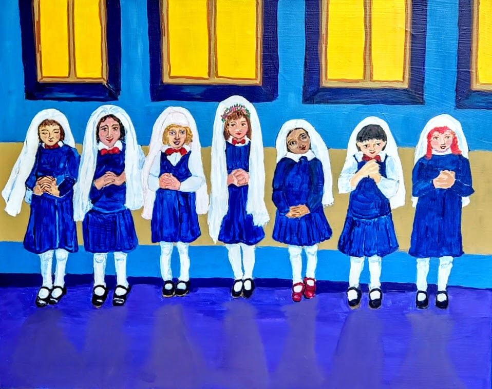 This evocative 16" x 20" acrylic on canvas belongs to the artist's distinguished "Memories, Real and Imagined" signature series, depicting seven young girls in traditional white veils and blue dresses awaiting their First Communion ceremony. The work captures a pivotal moment in Catholic childhood, where anticipation and solemnity intersect in this important religious milestone.