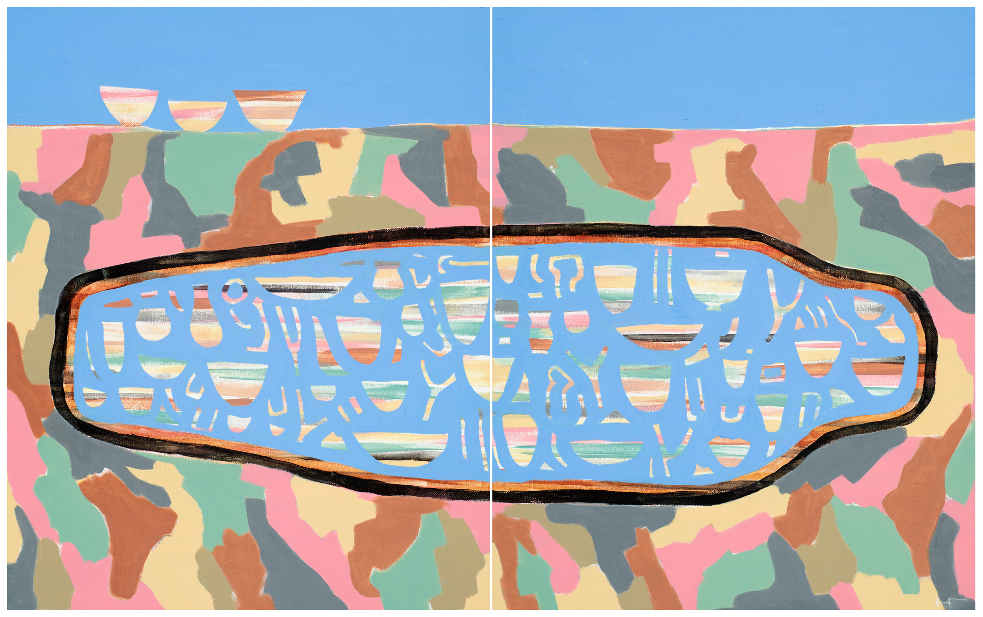 This dyptych artwork depicts the symbol of the coffin buried underground yet filled with artifacts. Discovering a way of uncovering the buried treasure found on the canvas, during 2020 and 2021 I loved this way of working. It was extremely satisfying and helped me be mindful and present. The concentration required to excavate an object using Australian Sky Blue Matisse acrylic left me more relaxed.
