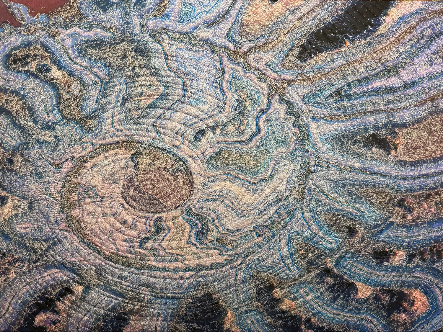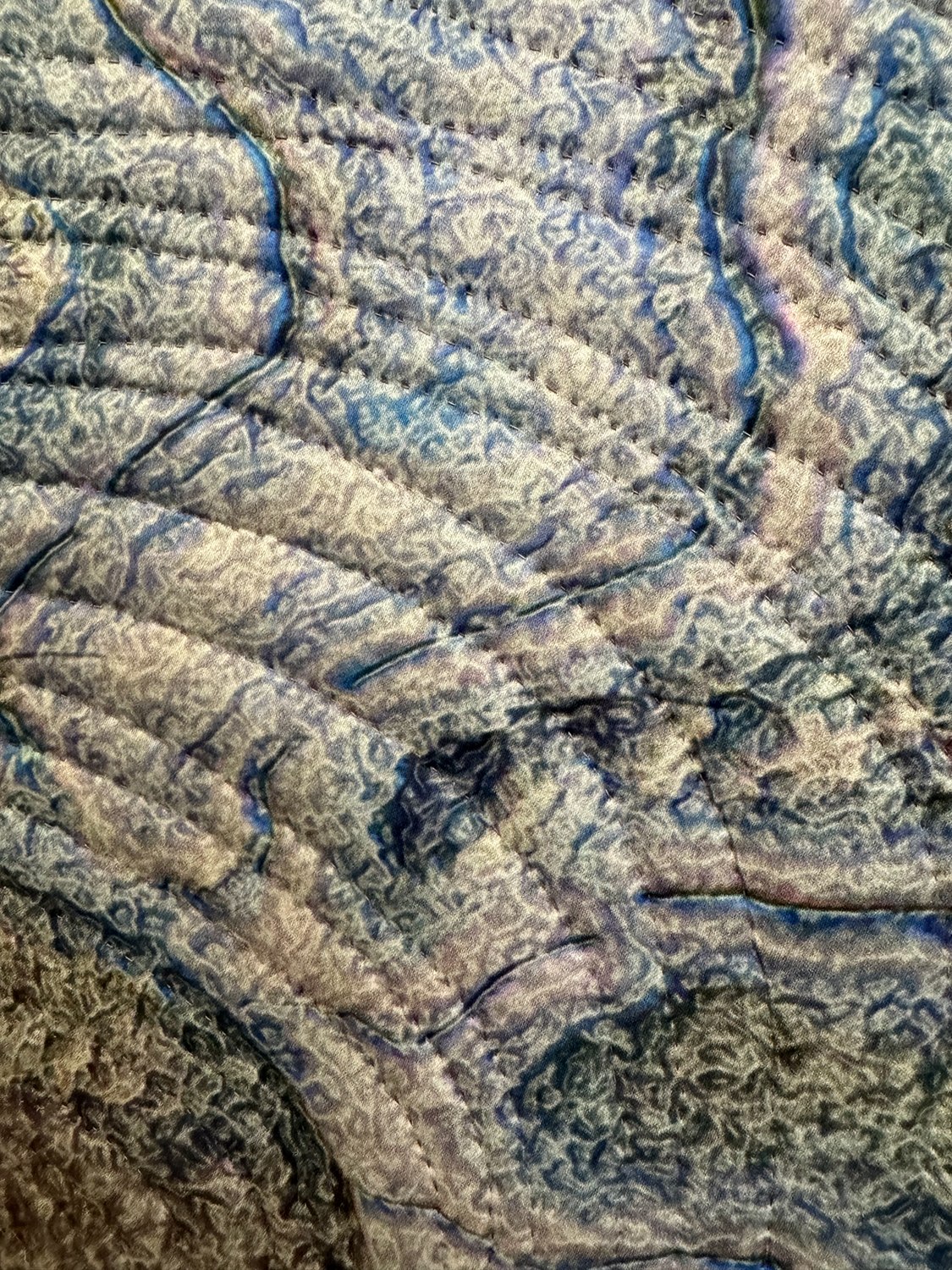 digitally manipulated photography, printed on organic cotton sateen, hand quilted, gallery wrapped on canvas stretchers, framed.