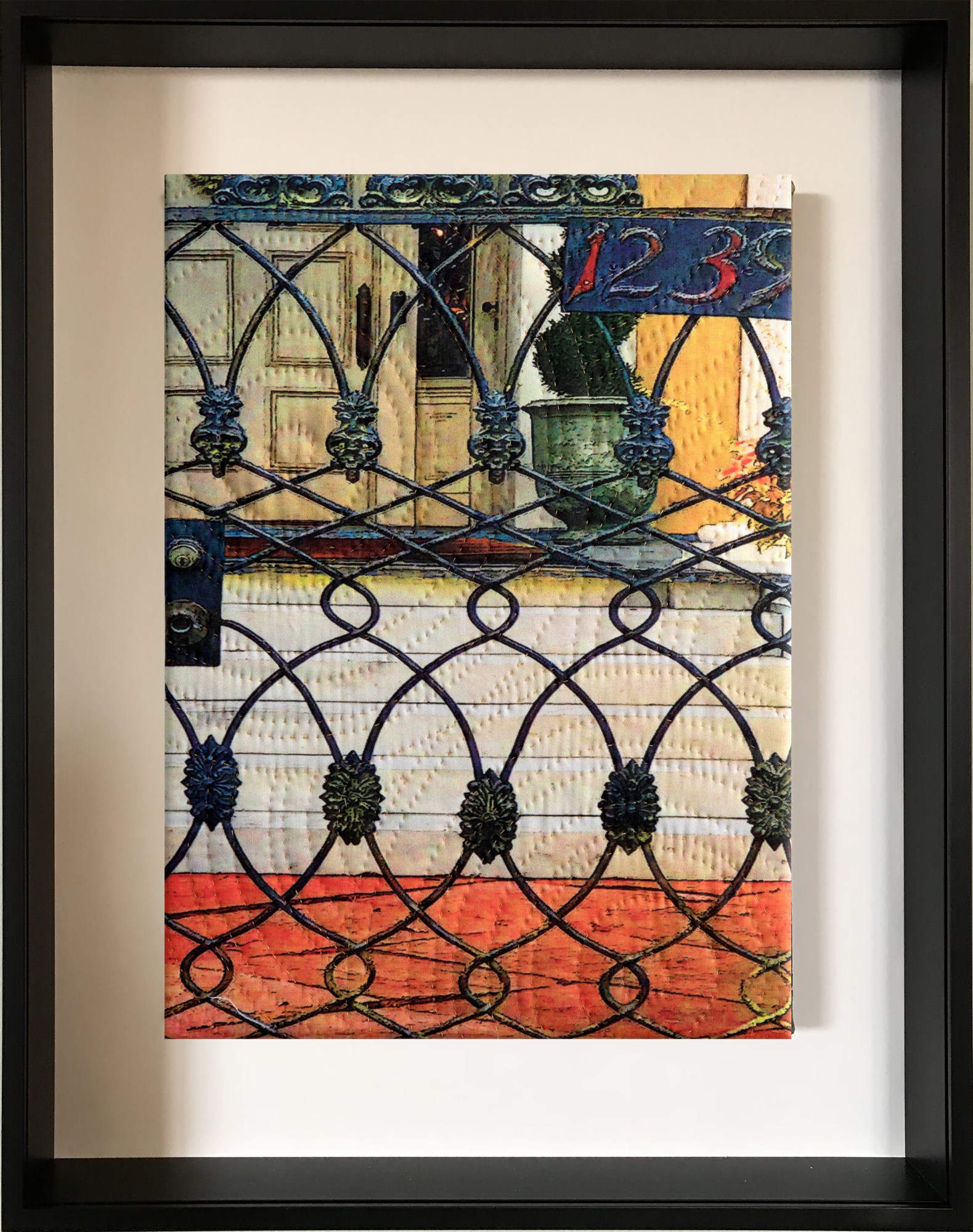 digitally manipulated photography, pigment printing on cotton, hand quilted, gallery-wrapped on stretched canvas, shadowbox frame