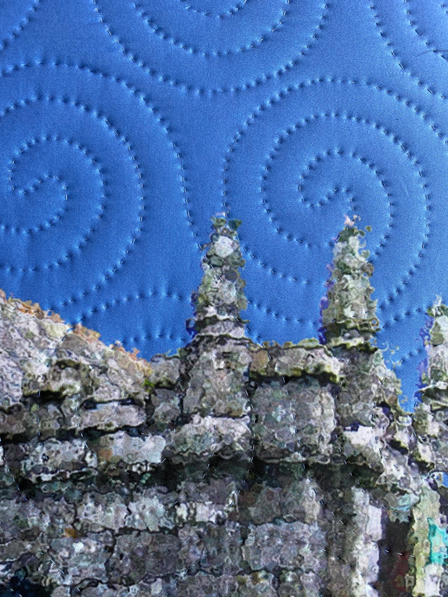 digitally manipulated photography, printed on organic cotton sateen, hand quilted, gallery-wrapped on stretched canvas, framed