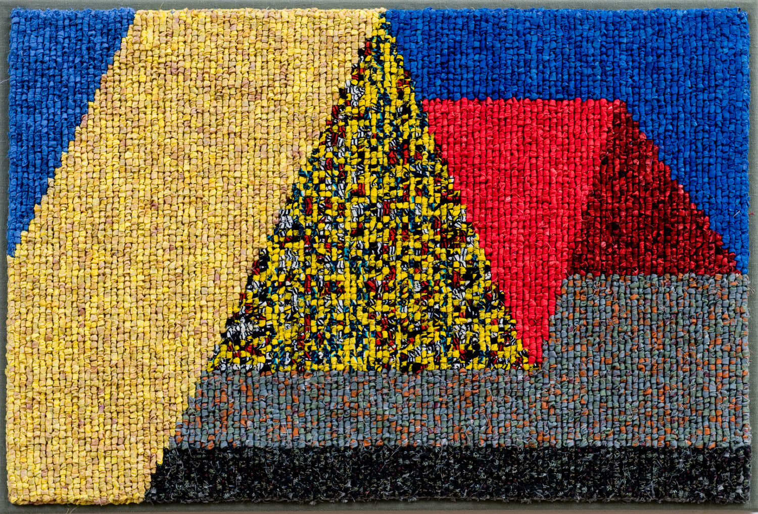 hand hooked cottons and linens on mesh canvas, mounted on linen, wood stretchers, ready to hang