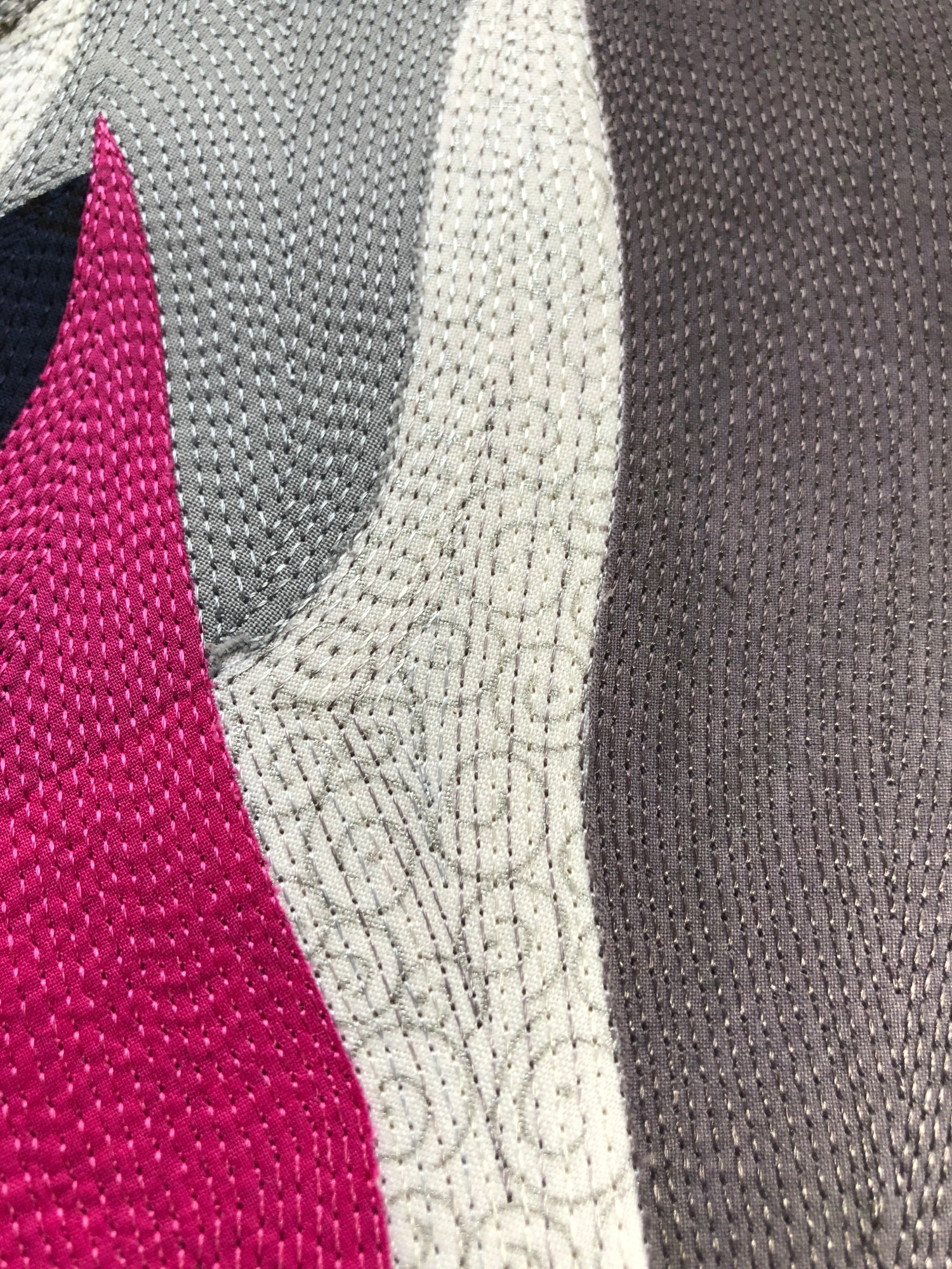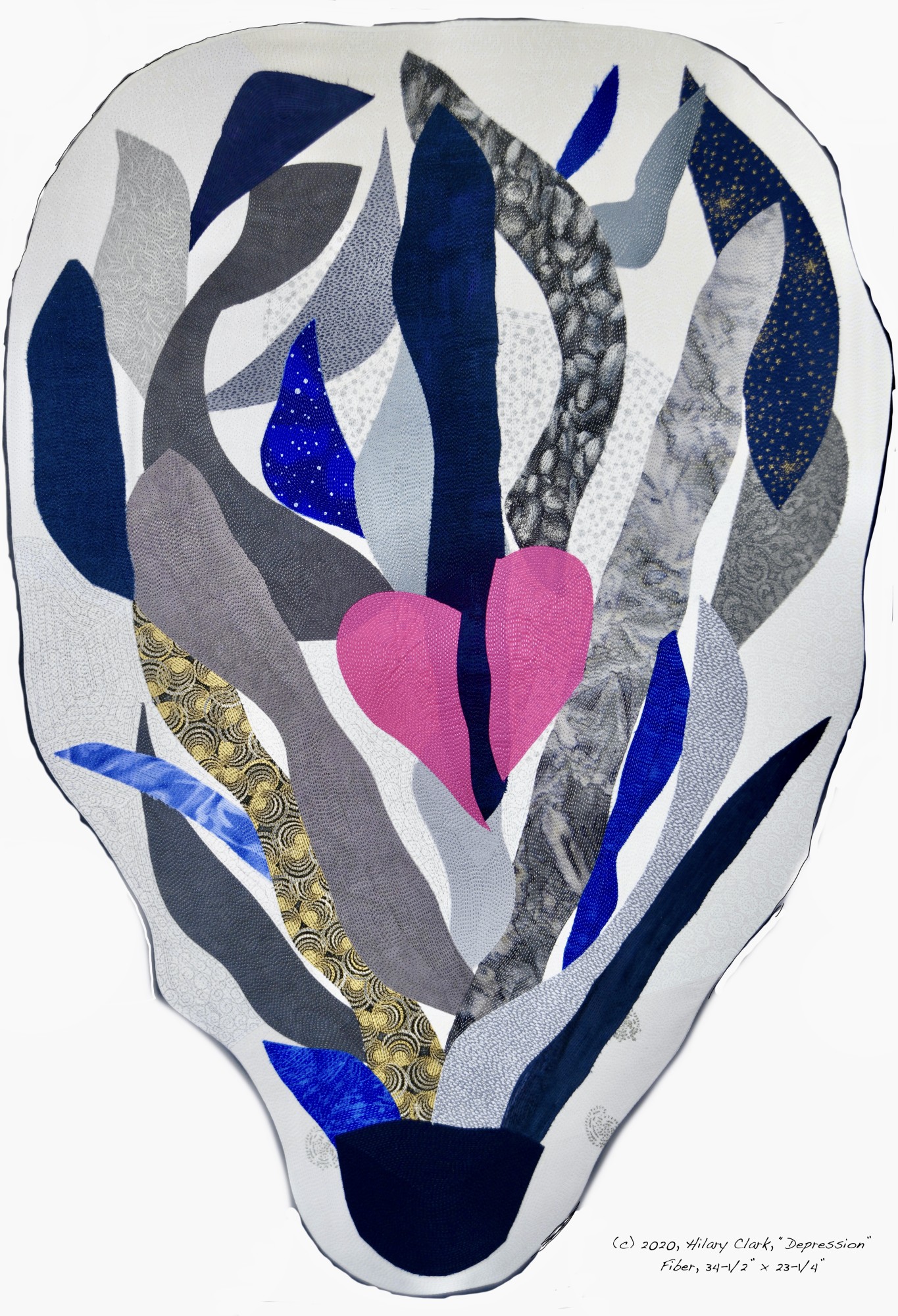 Abstract textured fiber painting. Raw edge applique, fused, machine quilted. This piece represents the stark landscape of depression centered around a broken heart. Part of my Feelings series.