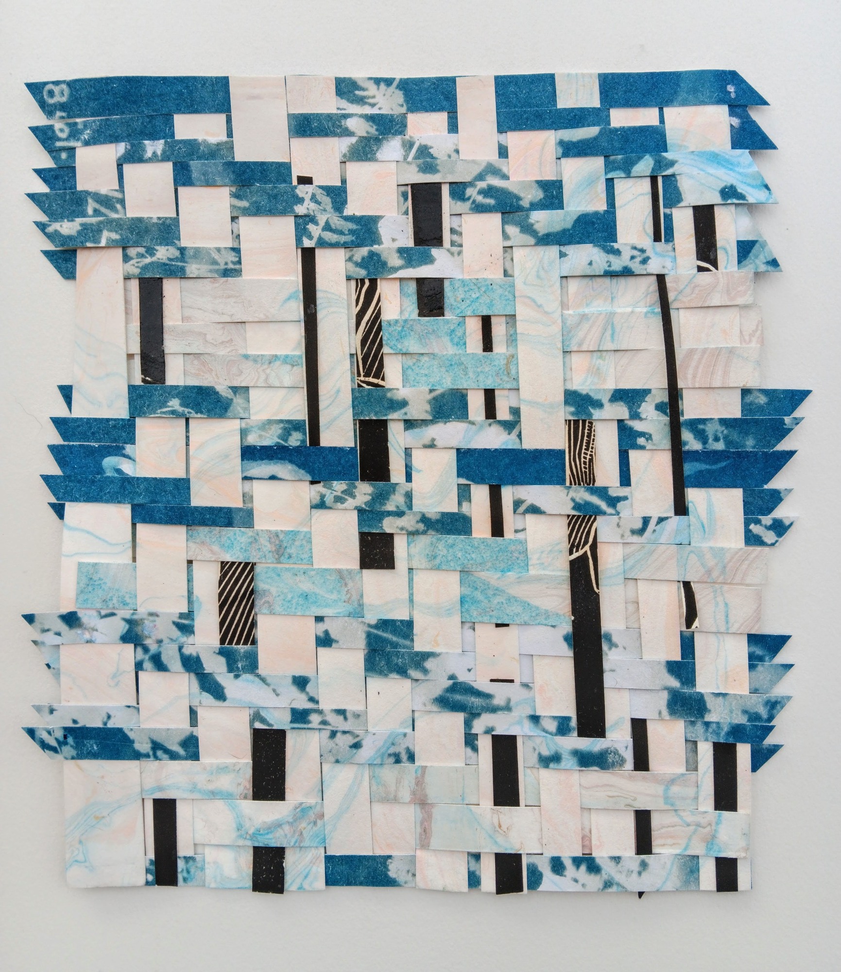 Hand-woven cyanotype printing in Manchester, NH, during artist residency at the Factory with a linocut of mountains from Tasmania and suminagashi marbling in medium widths of hand-cut paper.