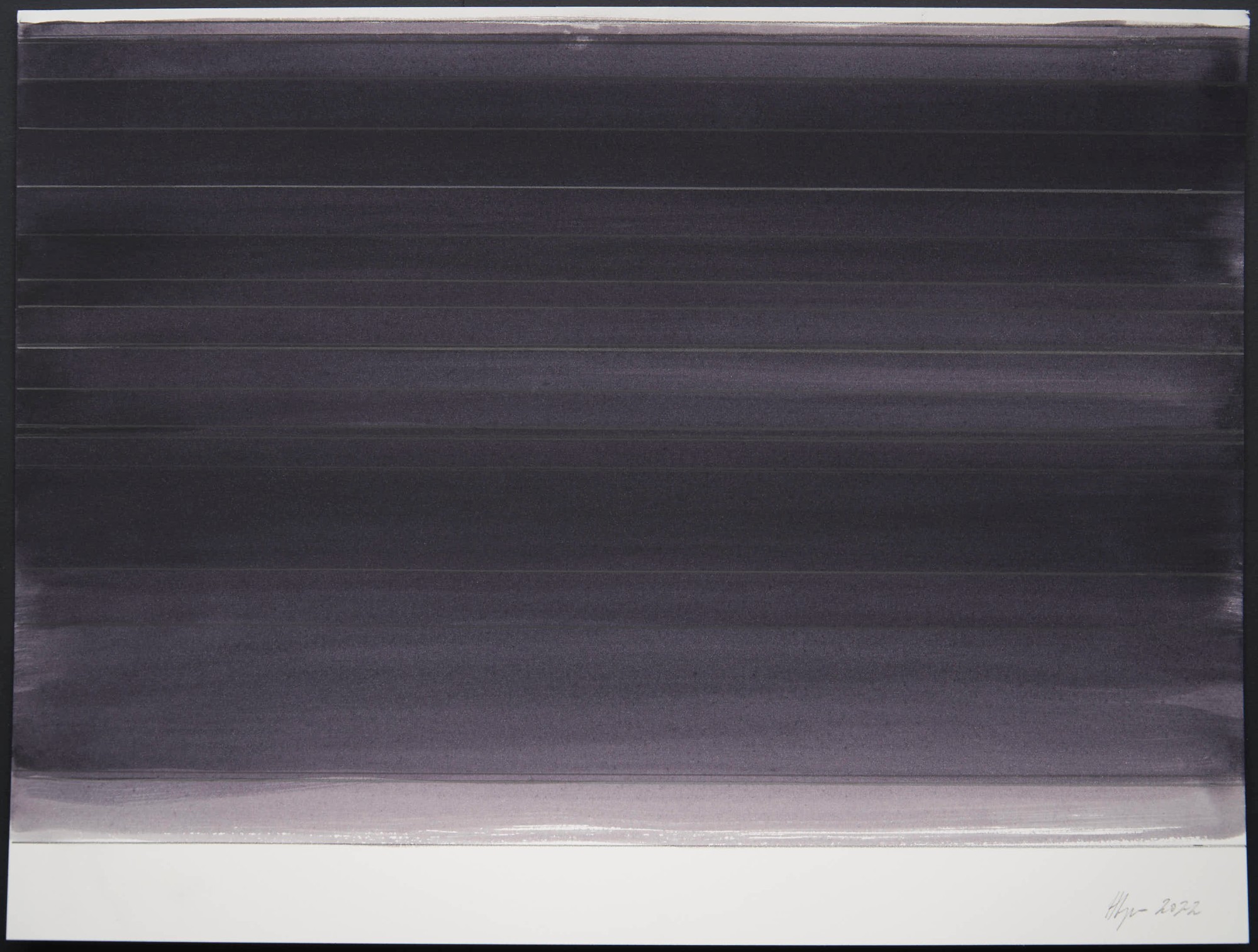 This portfolio of ink paintings is made up of 16 works in total. They are made with oak gall ink, hand made after a renaissance formula, a mixture of oak gall acid, iron sulfate, gum arabic, and white wine. Each painting is made up of 12 horizontal stripes, painted across the surface with a soft brush. The formula for the width of the stripes as well as placement is based the digits of hexadecimal pi.
