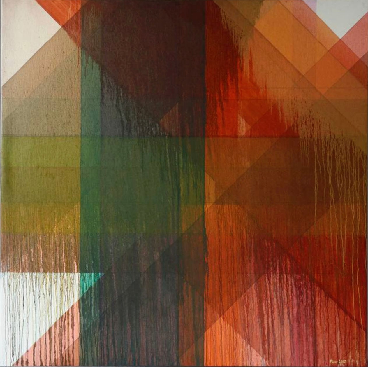 Málverk 4 í röð olíumálverka á striga, 200 x 200 cm að stærð, frá 2017. Myndin er byggð upp af 16 röndum, mismunandi breiðum sem málaðir eru í mismunandi átt þvert yfir flötinn, breidd randar, lega línu, stefna línu, litur, litablanda, er allt ákvarðað út frá aukastöfum pí.
