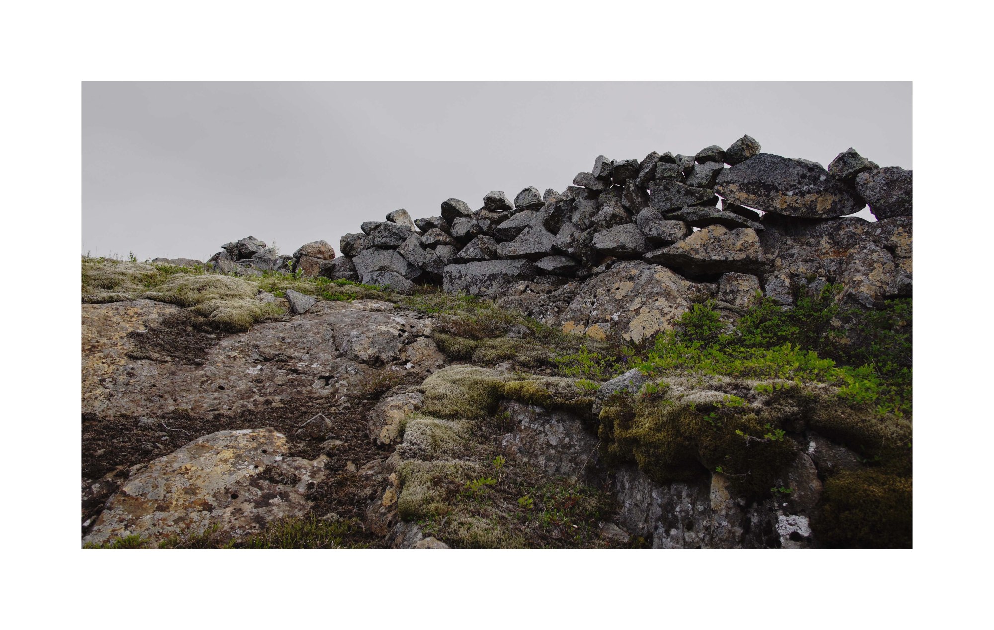 Skógargerðishleðsla is a portfolio of 15 gyclée printed images shot in the farmstead Skógargerði in eastern Iceland. It is a documentation of a more than 5 km stone wall made by farmer Gísli Helgason following the first world war, to fence sheep in. The work first follows the wall uphill from the lake to the crest of the hill, before continuing to follow it along the hillcrest. At times the task was quite difficult due to the forest having grown over the wall by time. The image is sized 20x36 cm on a 28x43 cm sheet.