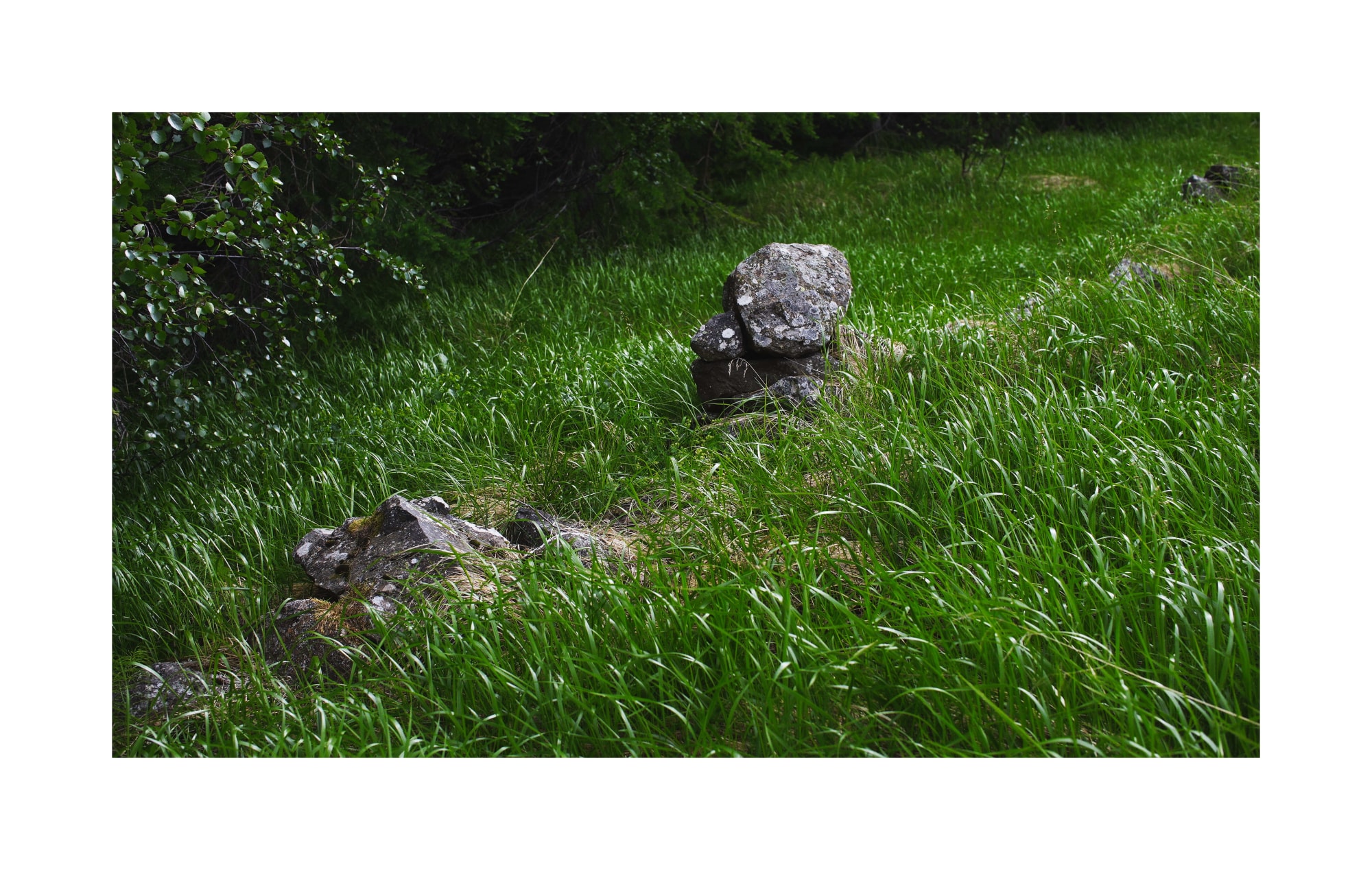 Skógargerðishleðsla is a portfolio of 15 gyclée printed images shot in the farmstead Skógargerði in eastern Iceland. It is a documentation of a more than 5 km stone wall made by farmer Gísli Helgason following the first world war, to fence sheep in. The work first follows the wall uphill from the lake to the crest of the hill, before continuing to follow it along the hillcrest. At times the task was quite difficult due to the forest having grown over the wall by time. The image is sized 20x36 cm on a 28x43 cm sheet.