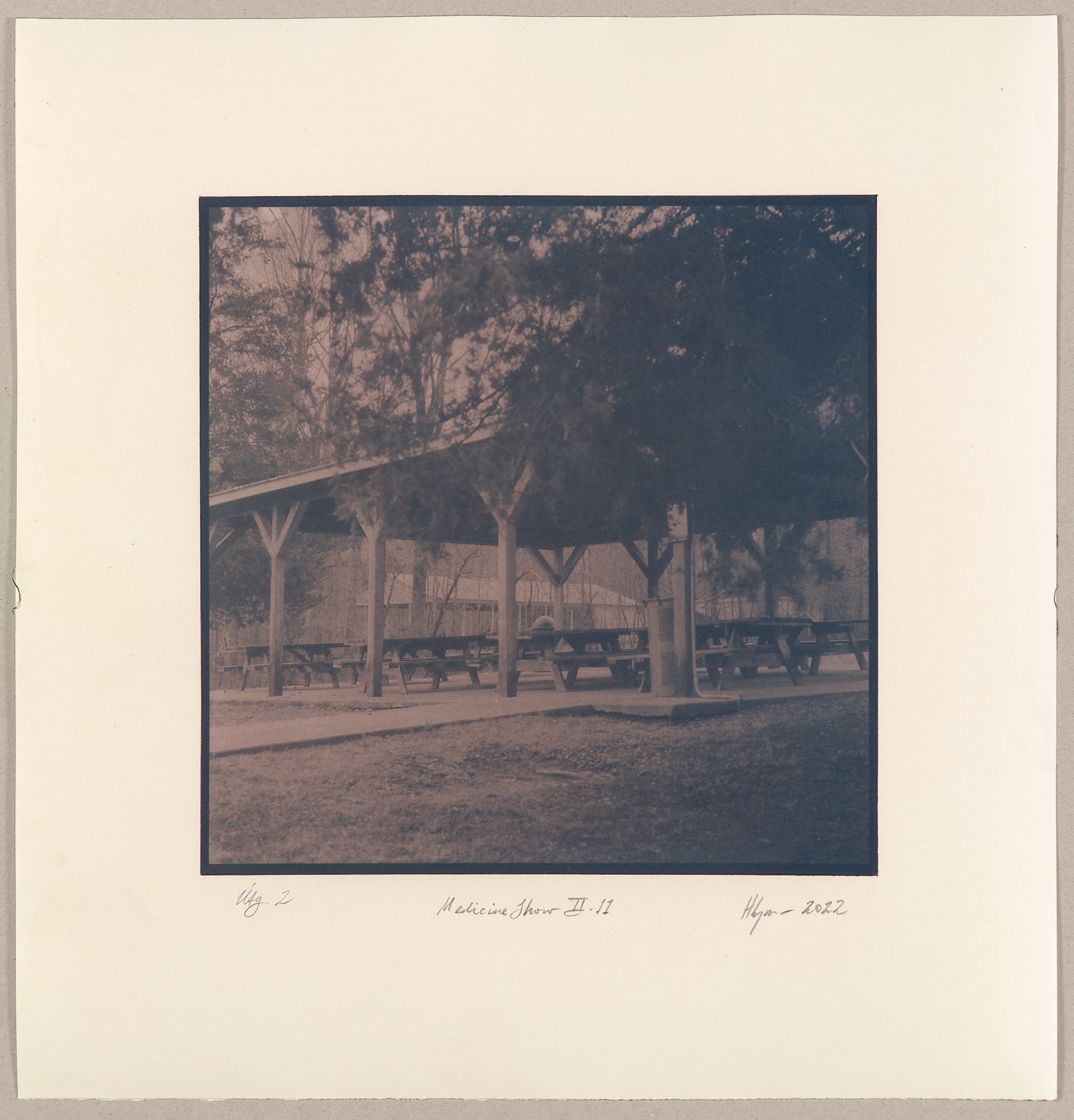 Technique: Cyanotype, tannic acid toned on Arches Natural White Watercolor Paper, Hot Press, 356 gsm, 31x31 cm on 48x46 cm sheet.