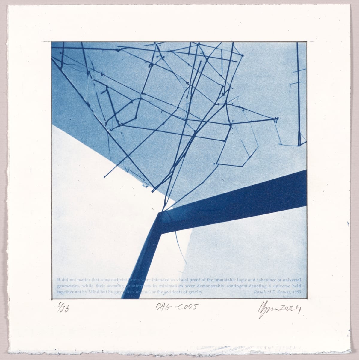 This is part of a series of toned cyanotypes based on images generated with a prompt referencing Rosalind E. Krauss’s Originality of the Avant-Garde, which illustrates critical art theory in a sense. Cyanotype, 21 x 21 cm on 28 x 18 cm sheet Saunders Waterford 300g HP natural paper, limited edition of 6. Stable diffusion generated the original image, further post-produced in On1 Resize AI, Affinity Design, and Capture One. PiezoDN produced the digital negative.