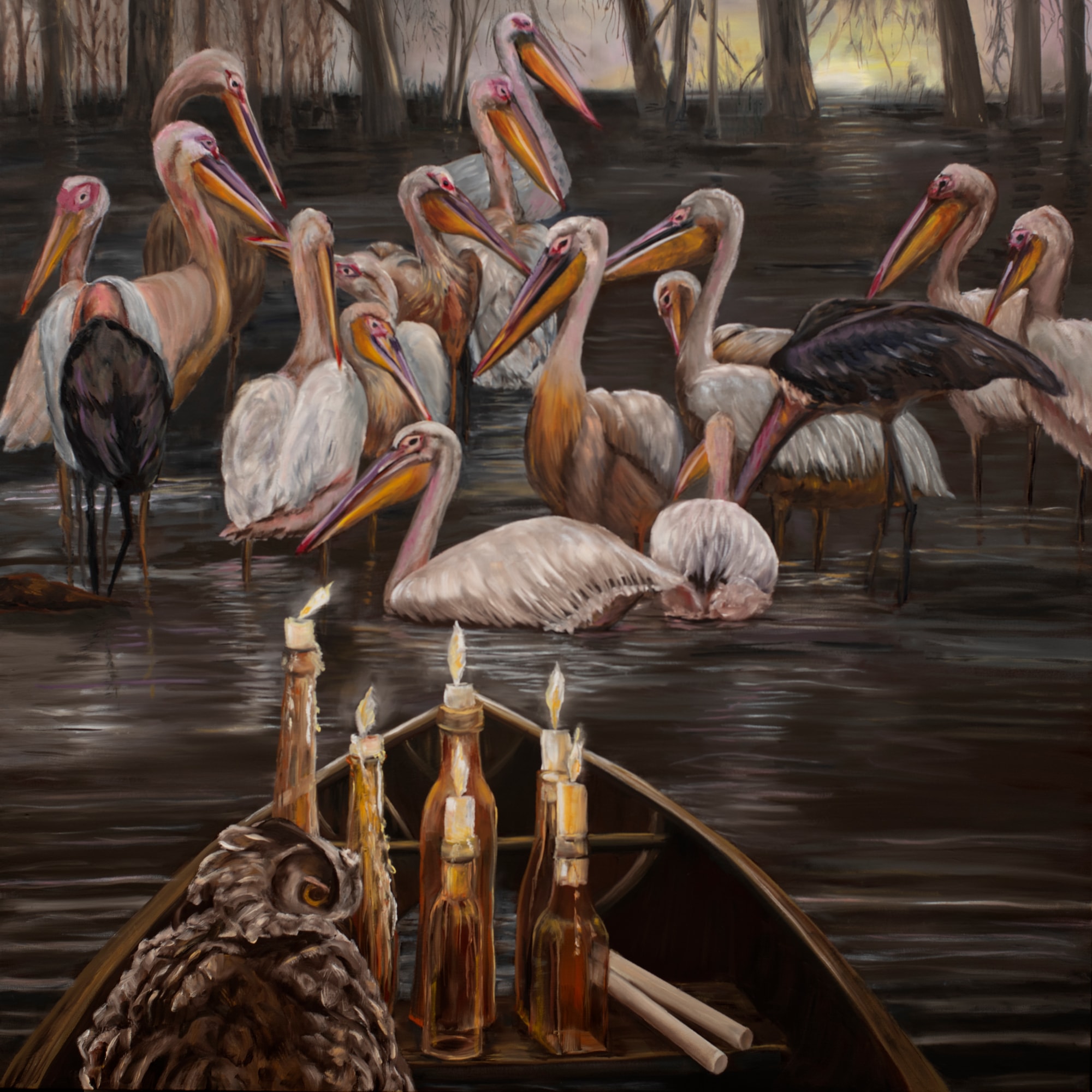 Landscape, Birds, Owl, Pelican, Boat, Candles