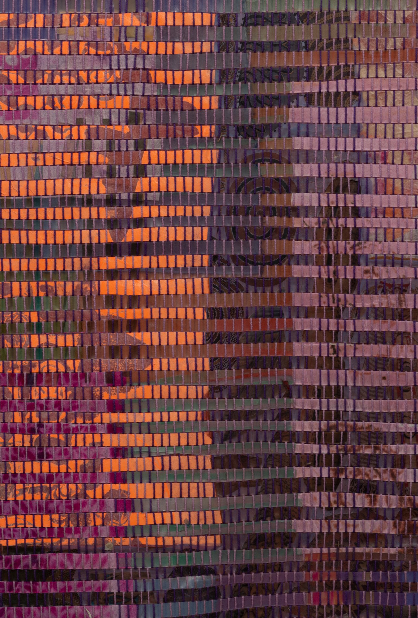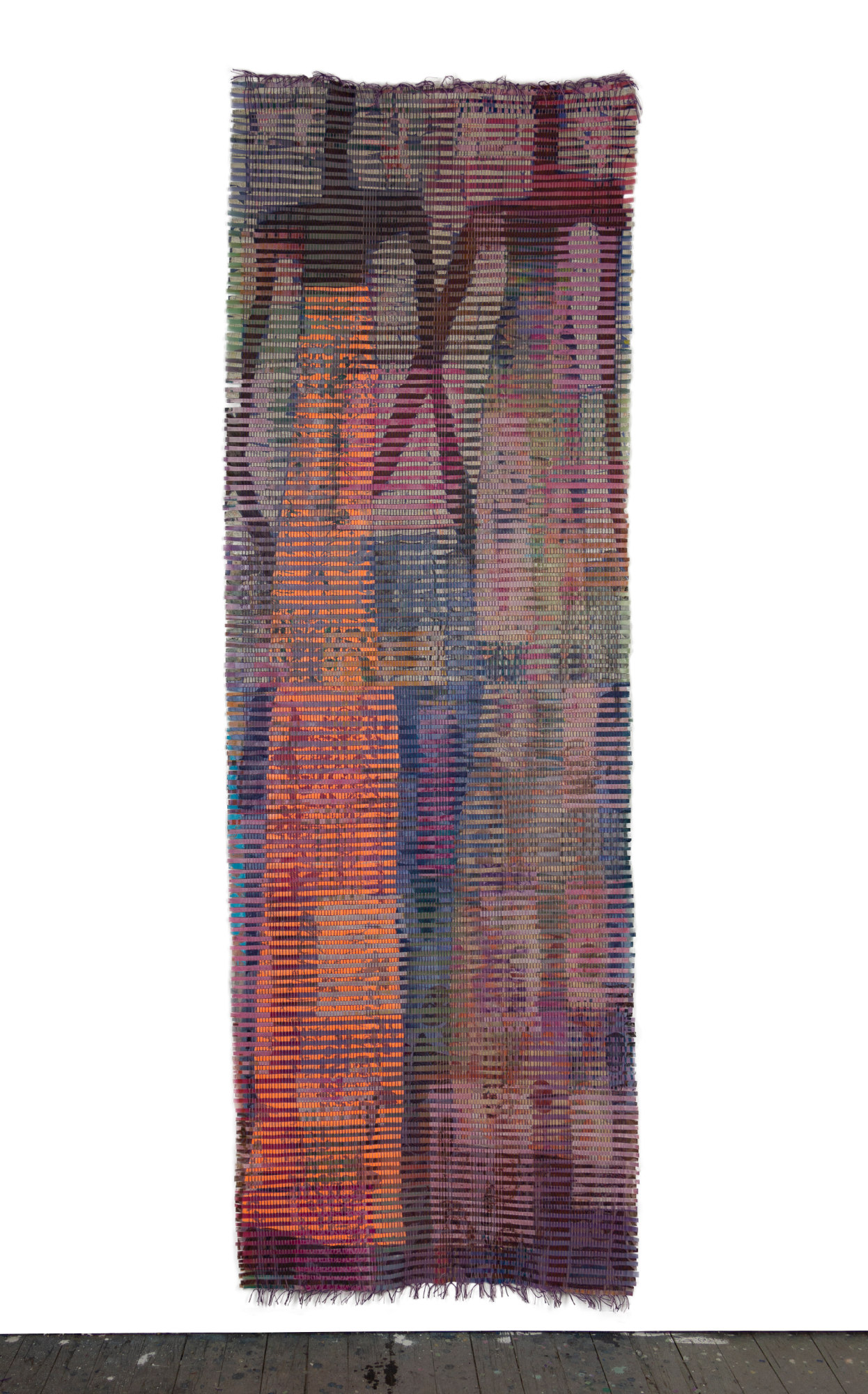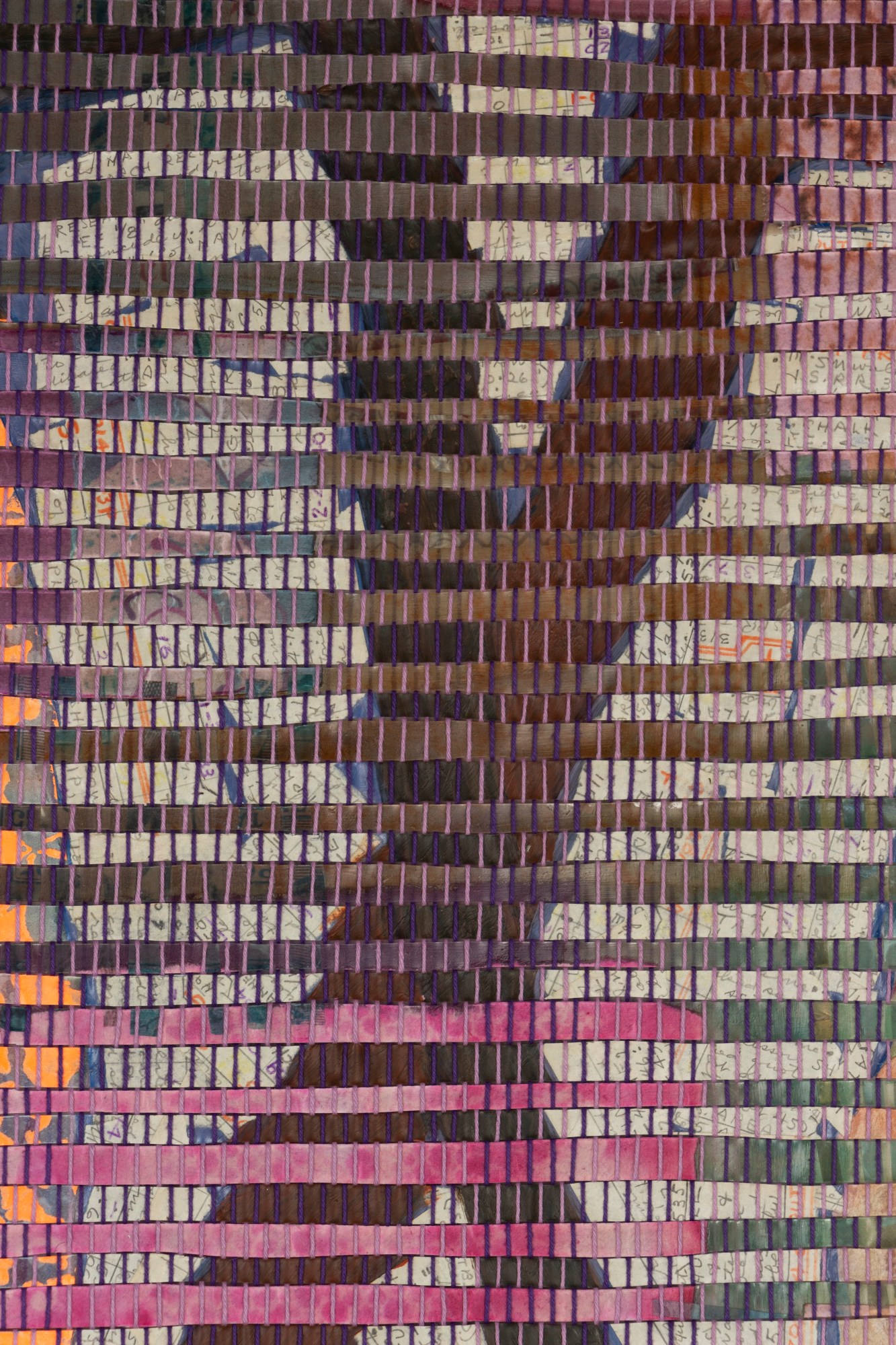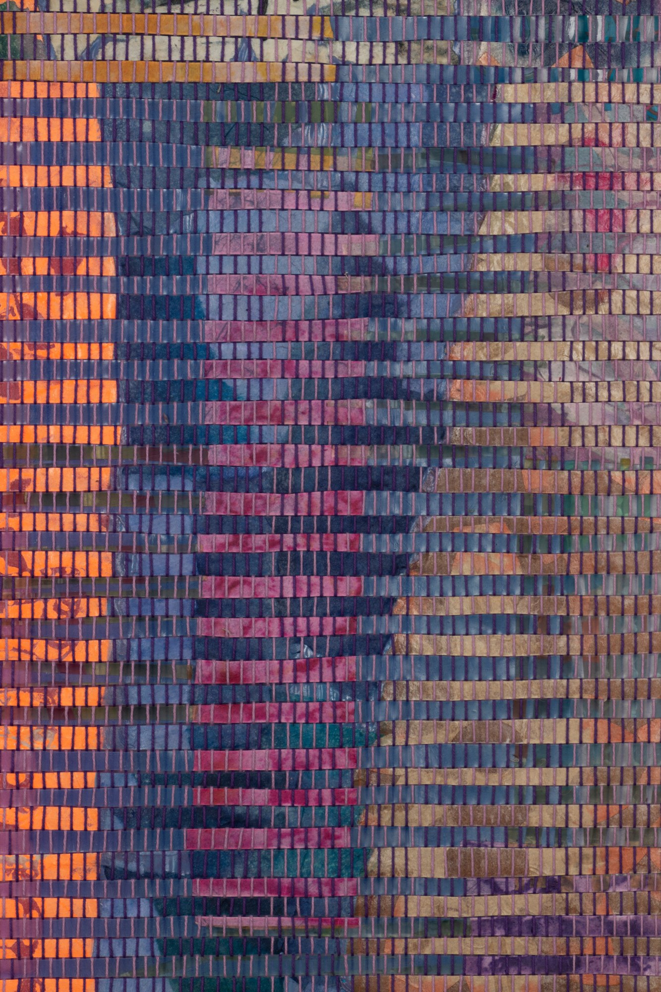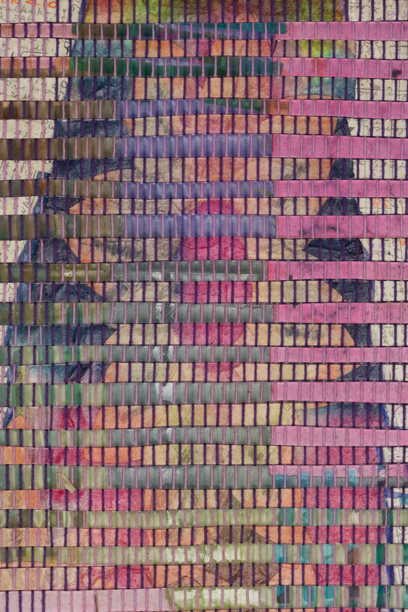 These works started as large collages on clear vinyl. I have always covered my tables with clear vinyl when I work and teach in the studio. I was adhering silk to the plastic and used cuttings from batiked paper often working on both sides of the vinyl. I suddenly got an idea to cut the collages in strips and weave them on a loom. My process style has always been very systematic. Objects lined in rows etc. The concept with these woven pieces was to alternate rows with 2 collages. This enables beautiful depth and superimposed imagery. It is also a mystery how the final piece will come out. The strips are cut uniformly and woven in order. The result is organic in nature, absolutely cannot be planned. The use of dyed silk and other transparent overlays creates a richness when surrounded in an every-other type of order. These color and texture interactions and the overlaying of imagery answers the visual excitement that I am always reaching for in my work.