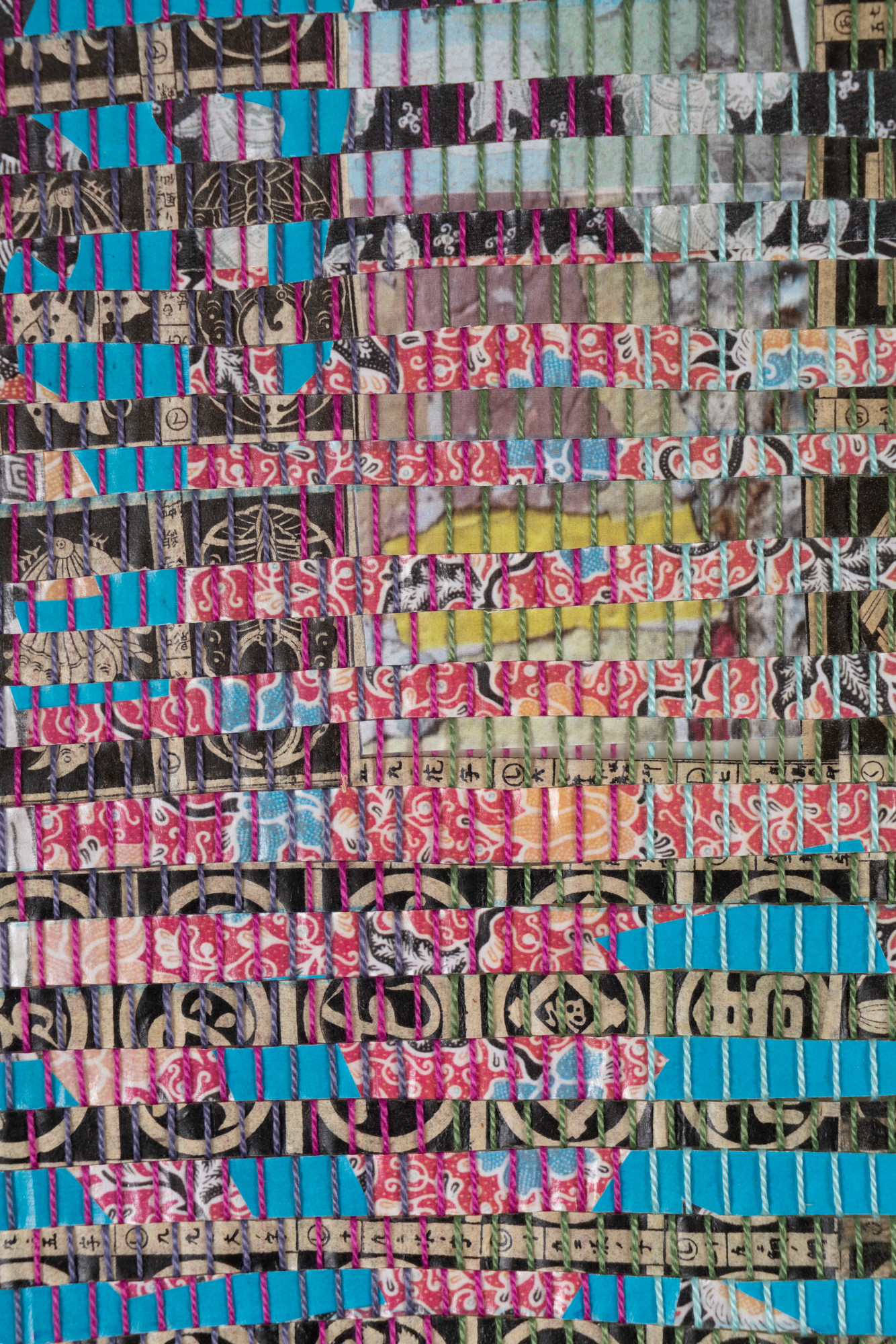 These works started as large collages on clear vinyl. I have always covered my tables with clear vinyl when I work and teach in the studio. I was adhering silk to the plastic and used cuttings from batiked paper often working on both sides of the vinyl. I suddenly got an idea to cut the collages in strips and weave them on a loom. My process style has always been very systematic. Objects lined in rows etc. The concept with these woven pieces was to alternate rows with 2 collages. This enables beautiful depth and superimposed imagery. It is also a mystery how the final piece will come out. The strips are cut uniformly and woven in order. The result is organic in nature, absolutely cannot be planned. The use of dyed silk and other transparent overlays creates a richness when surrounded in an every-other type of order. These color and texture interactions and the overlaying of imagery answers the visual excitement that I am always reaching for in my work.