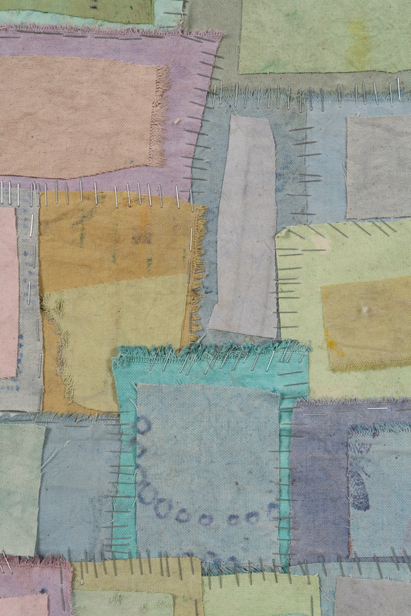 This collection of works are comprised of collages that have been broken up, rearranged, and organized into organically induced, colorful compositions. I am inspired by the challenge of repairing and recreating a new and unexpected surface and using the staples, an understandable method, as a connective device. The grid structure creates an overall sense of the construction The works begin as paintings or collages that are color inspired by landscape and horizon lines. I rely on using my acute use of color to add balance to a piece subtly contrasting the different order that has been created by the cut and often randomly rearranged and reconnected parts.