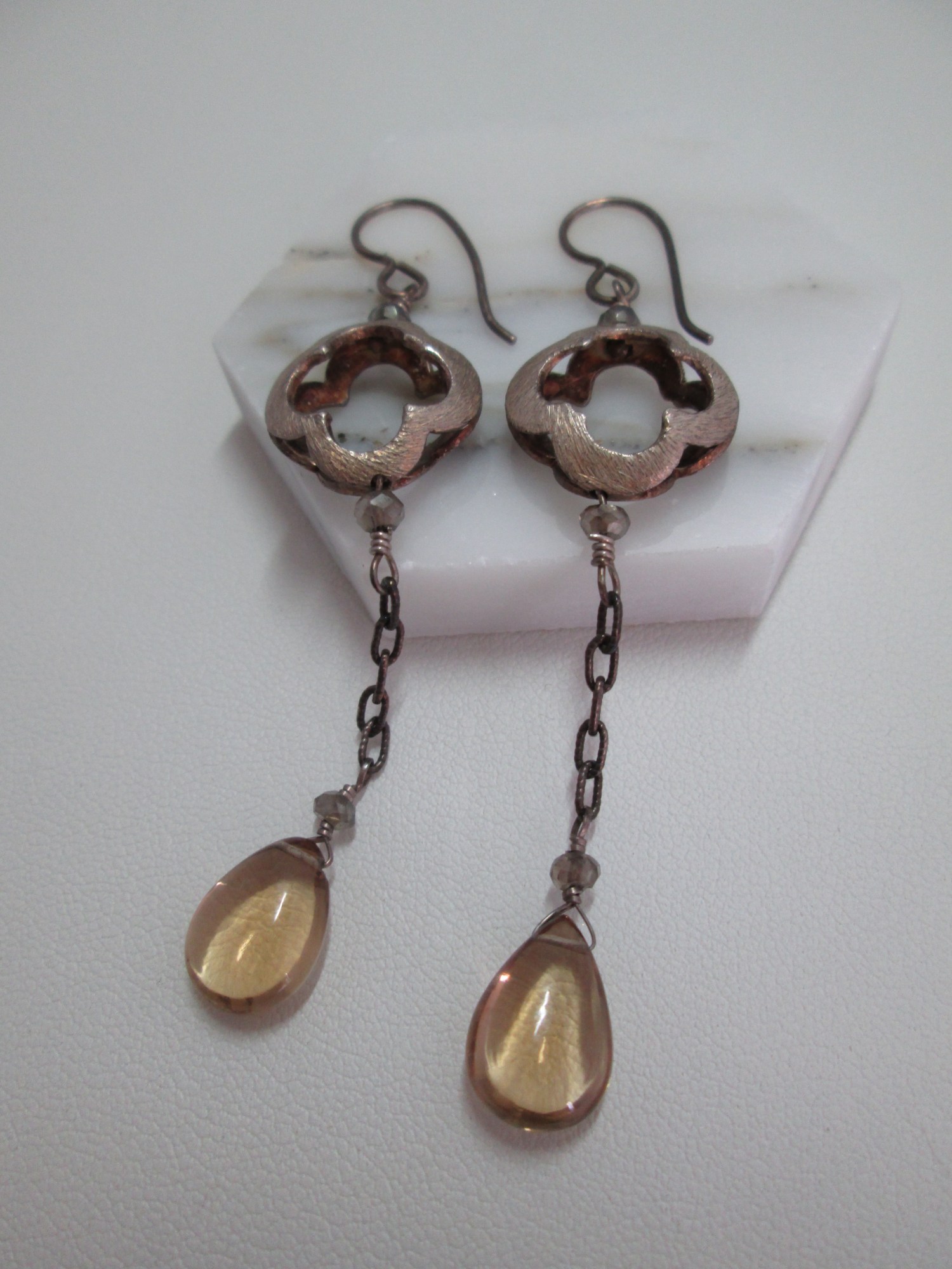 Champagne Quartz Drop Earring with SS Quatrefoil