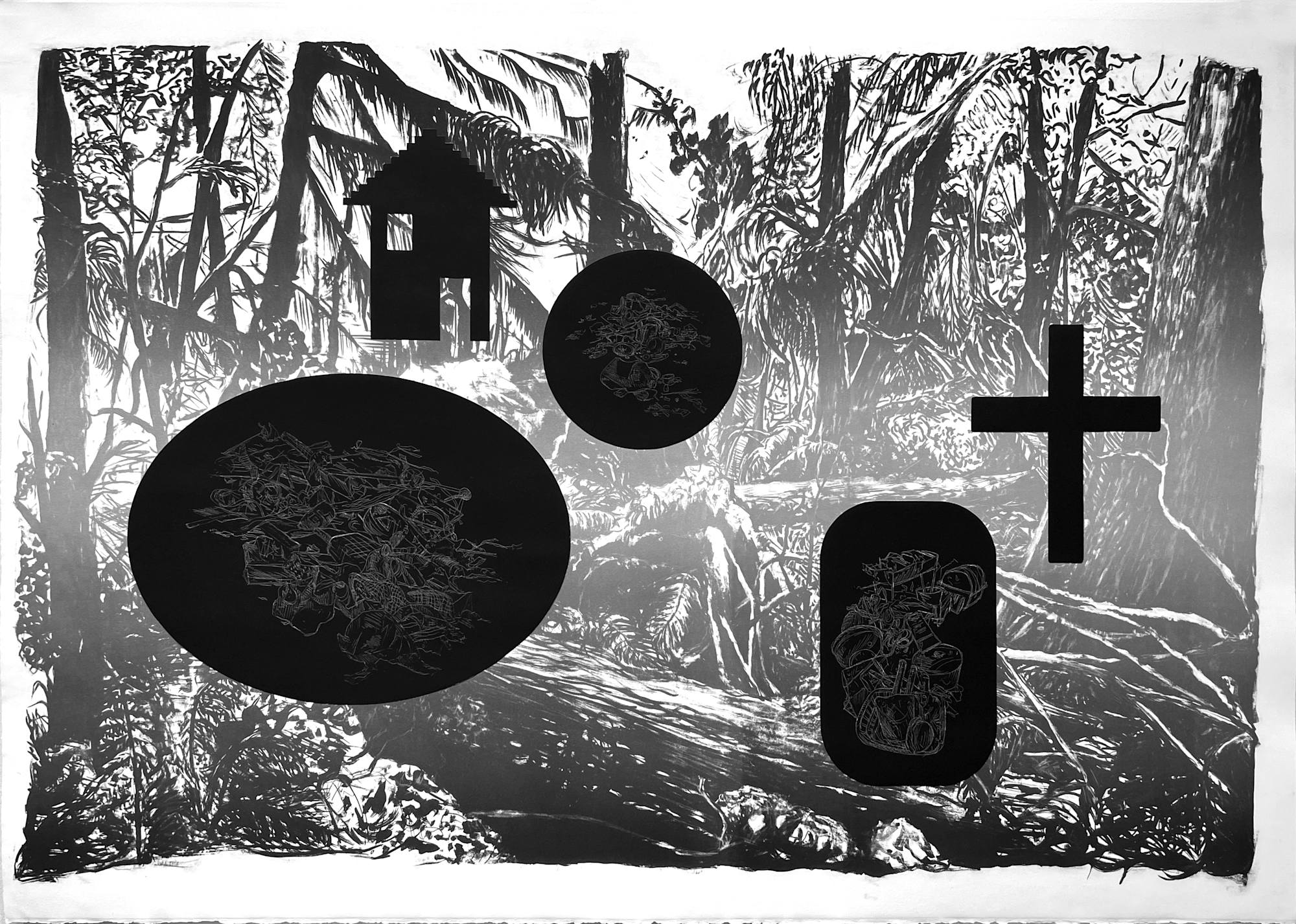 • three color blend roll lithograph with chine colle' reverse etching embellishments