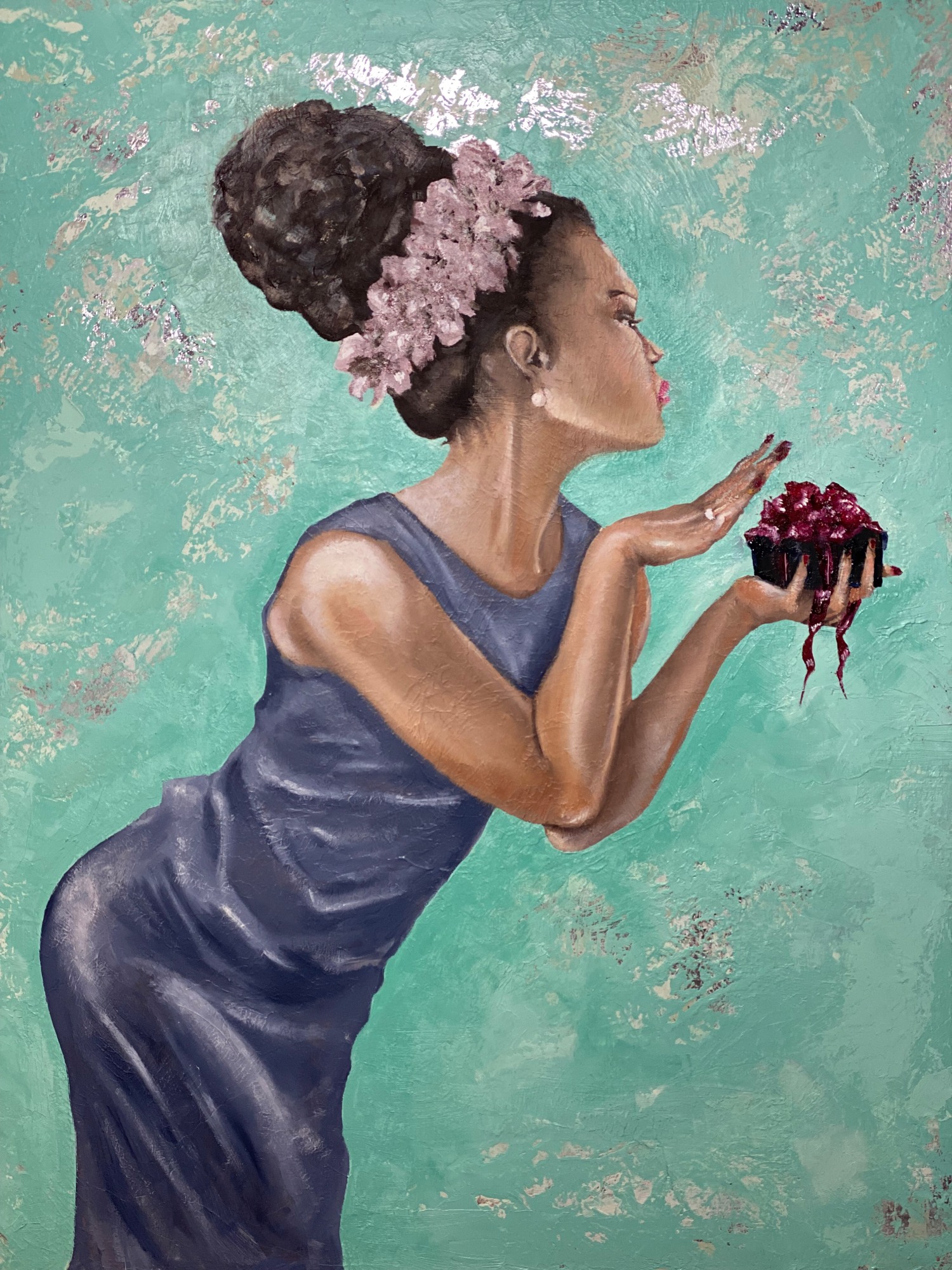 In this oil painting, a young Polynesian woman graces the canvas against a soft teal backdrop, with delicate hints of silver leaf shimmering through. Adorned with a crown of pink hibiscus and dressed in a blue garment that moves with the gentle curves of her body, pursed lips and a gentle glance, she presents a small gift to someone special.