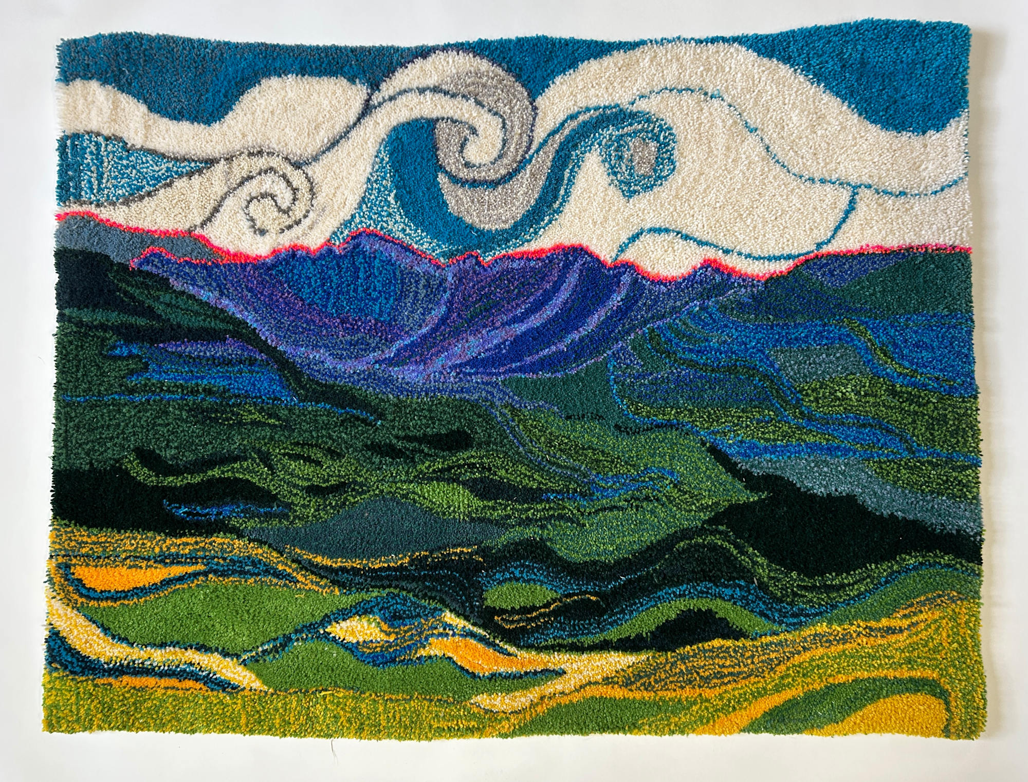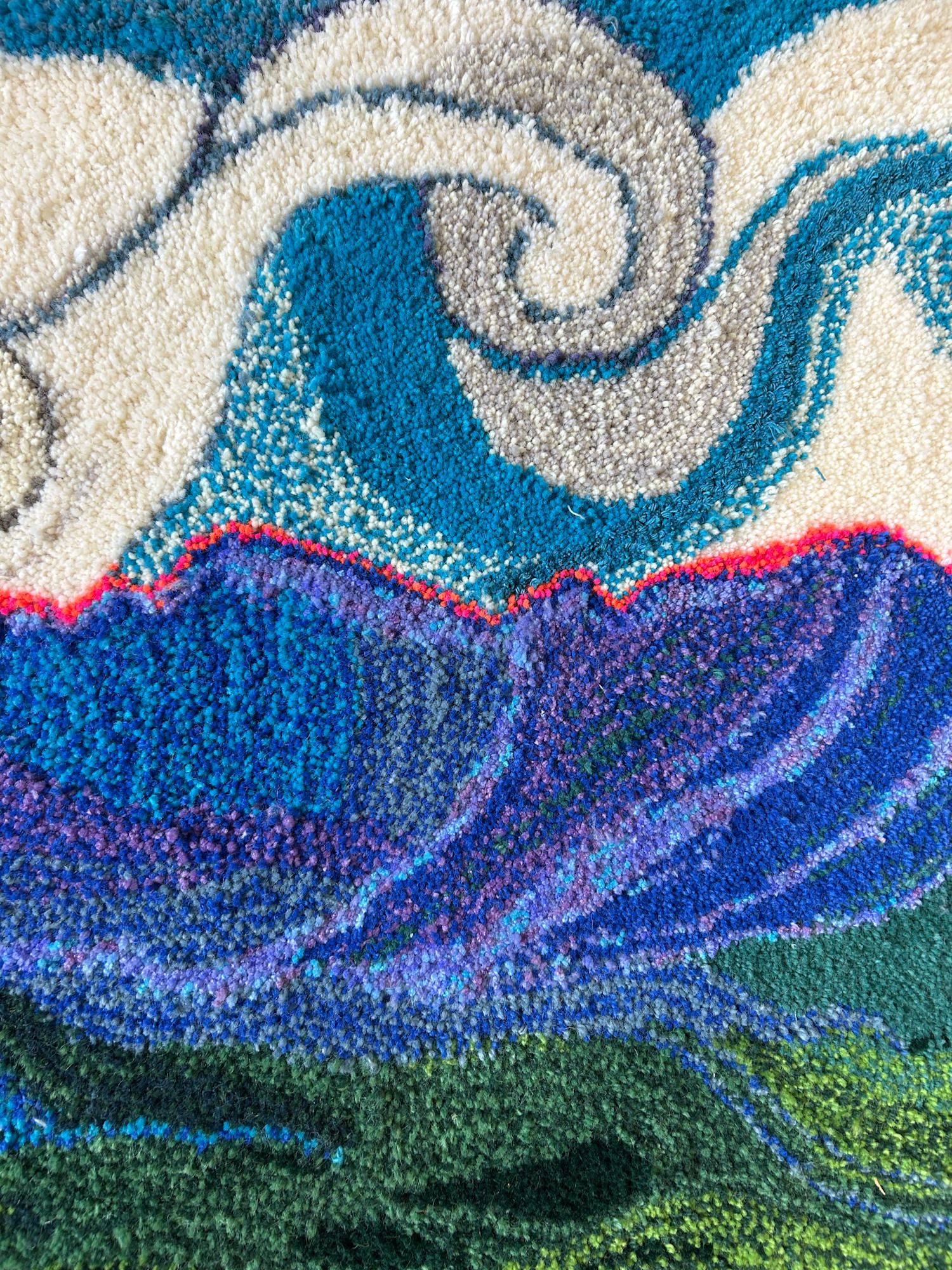 The swirling, flowing lines of the land, sky and clouds interpreted in a hand tufted wall piece made from wool and cotton.
