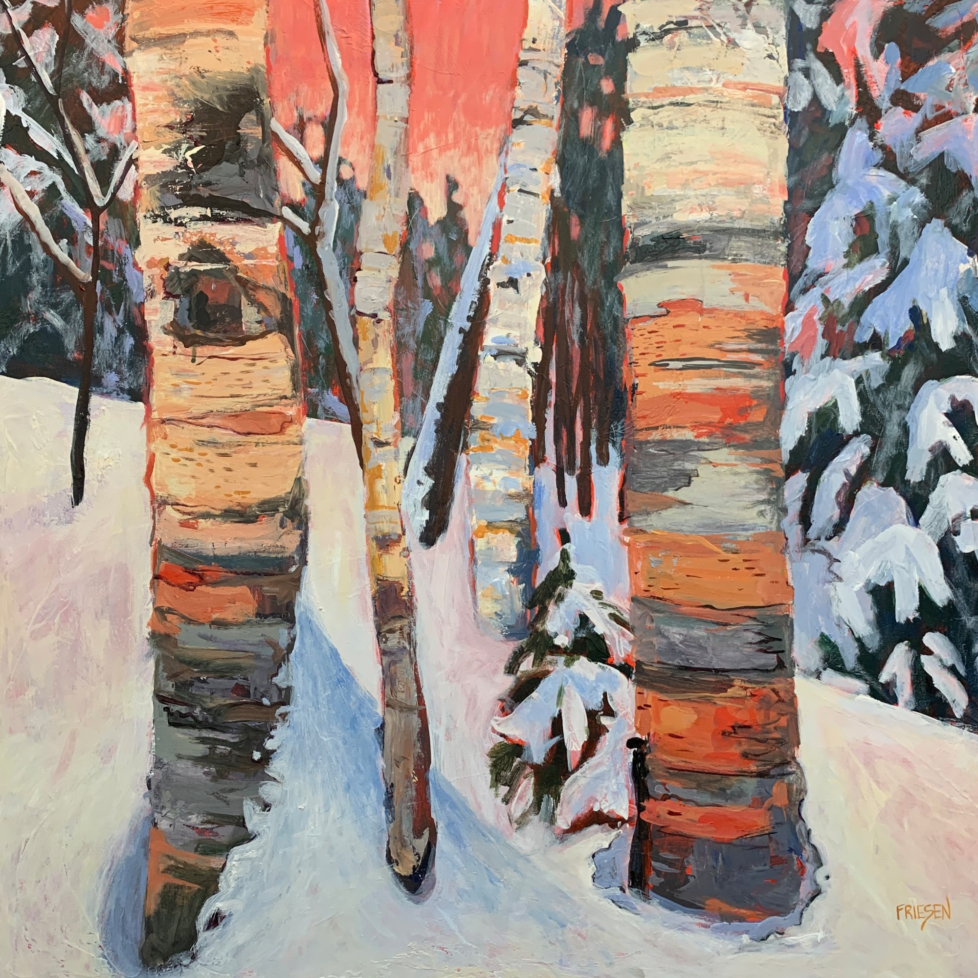 The warmth and delicacy of birch bark comes into focus in an otherwise stark winter landscape.