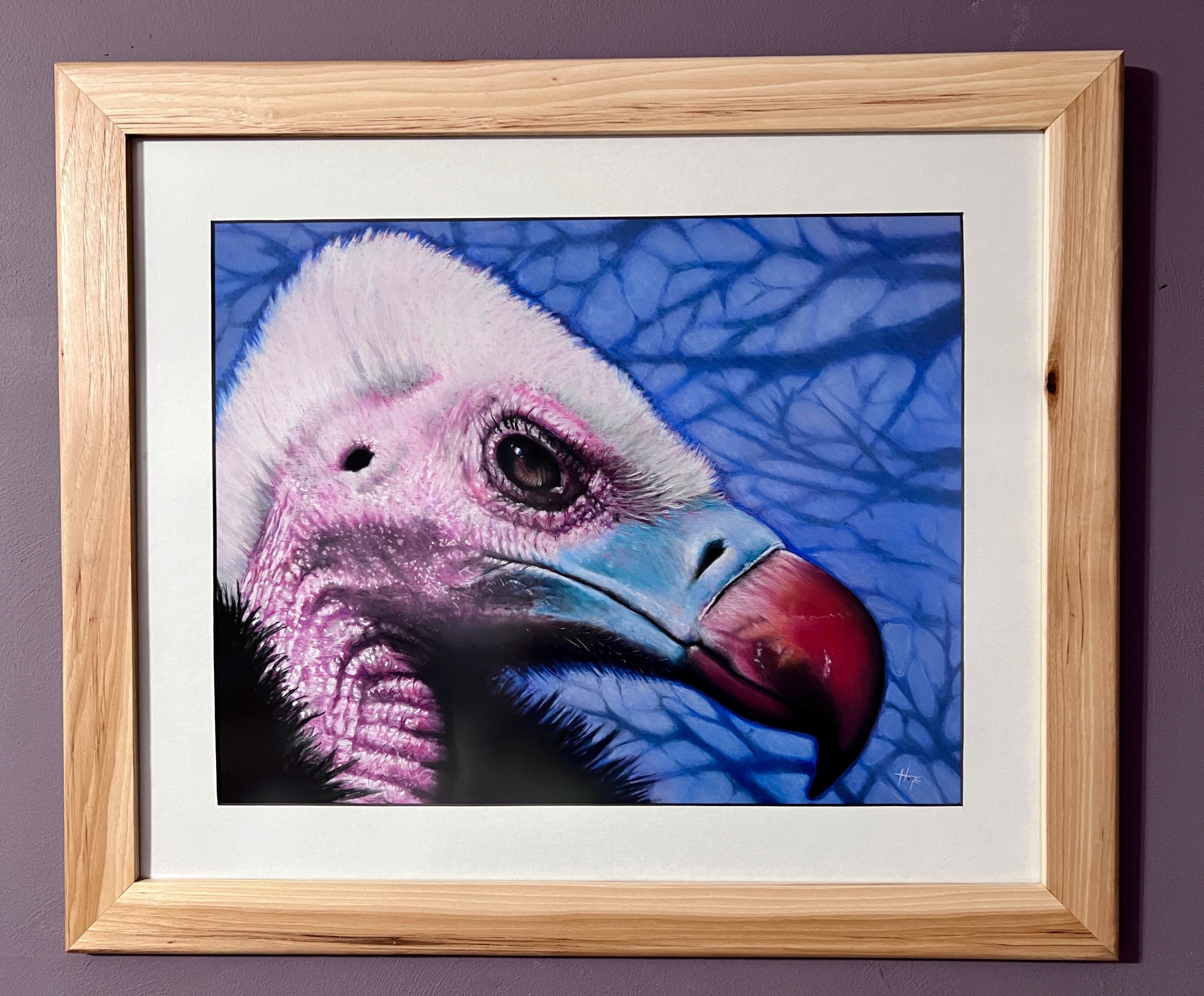 I love all the textures and colors in this face! Such an amazing animal. The branches in the background represent its preferred perch, A Baobab tree.