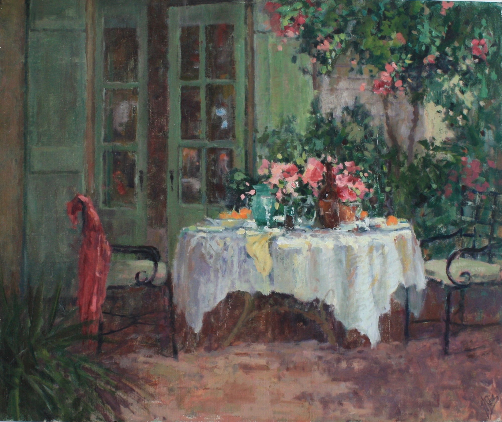 Painted from life in my garden this painting is a little bit of a still life as well as a landscape...it was a beautiful sunny day and the flowers were right out of the garden.