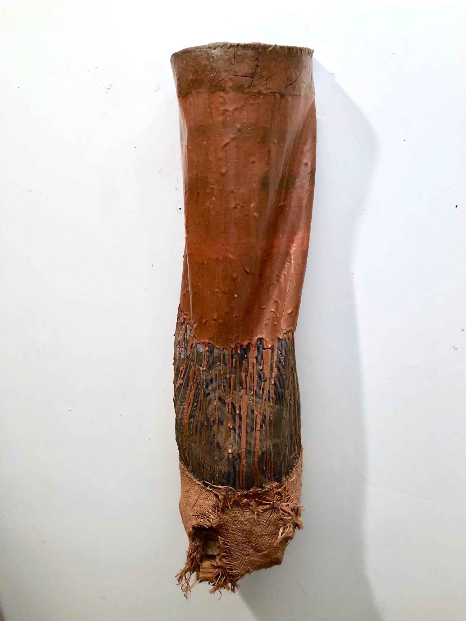 paint, wood, burlap, plastic resin glue, fiberglass screen, thread
