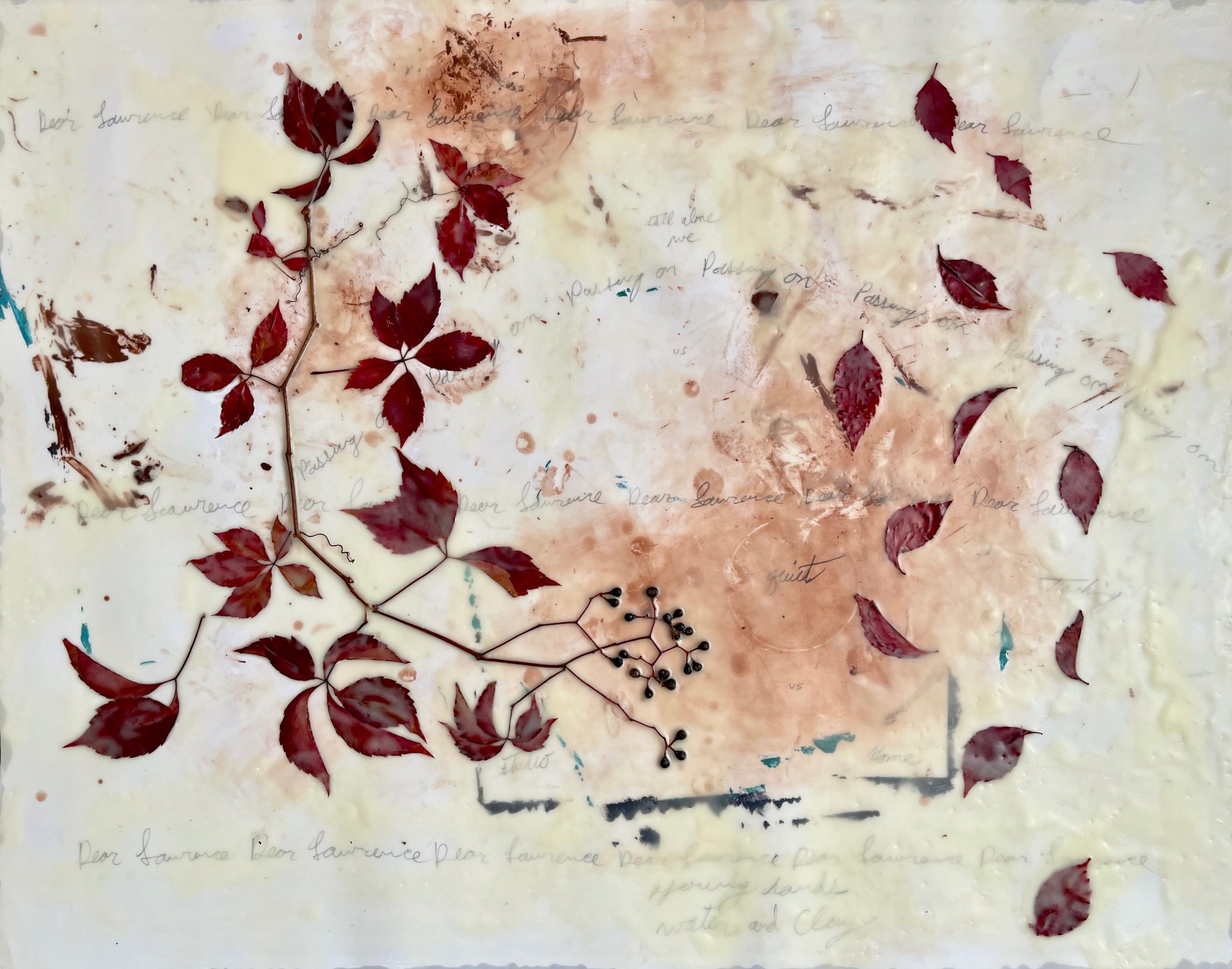 Pencil, wax, flora, clay residue on paper from my students clay pottery assignment