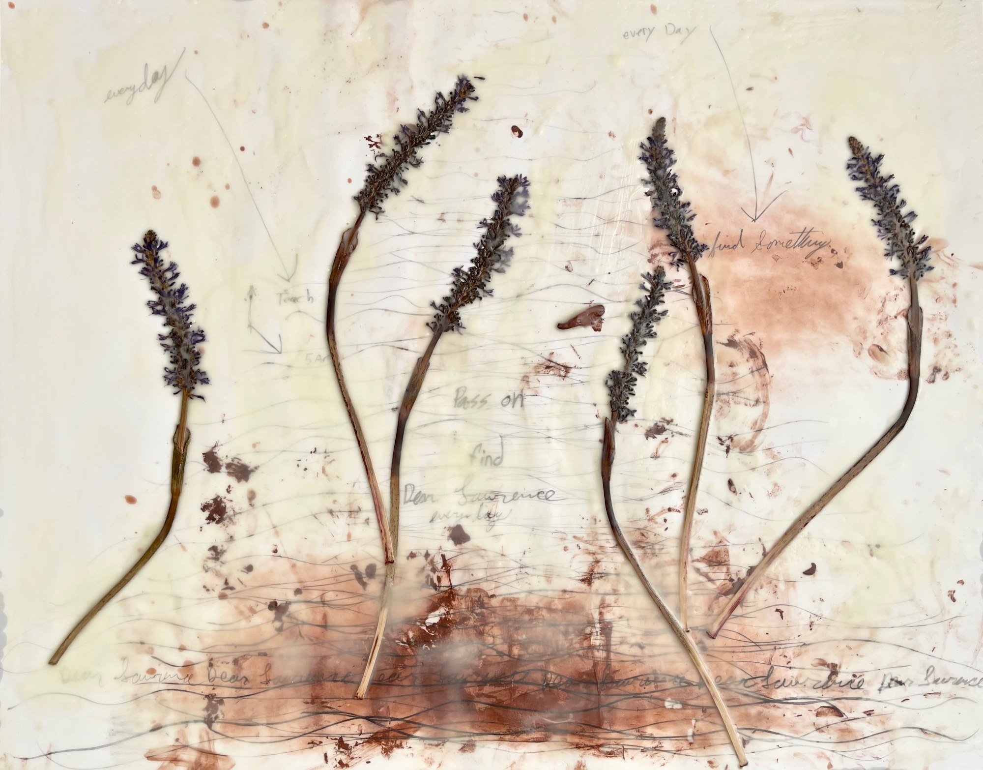 Pencil, wax, flora, clay residue on paper from my students clay pottery assignment