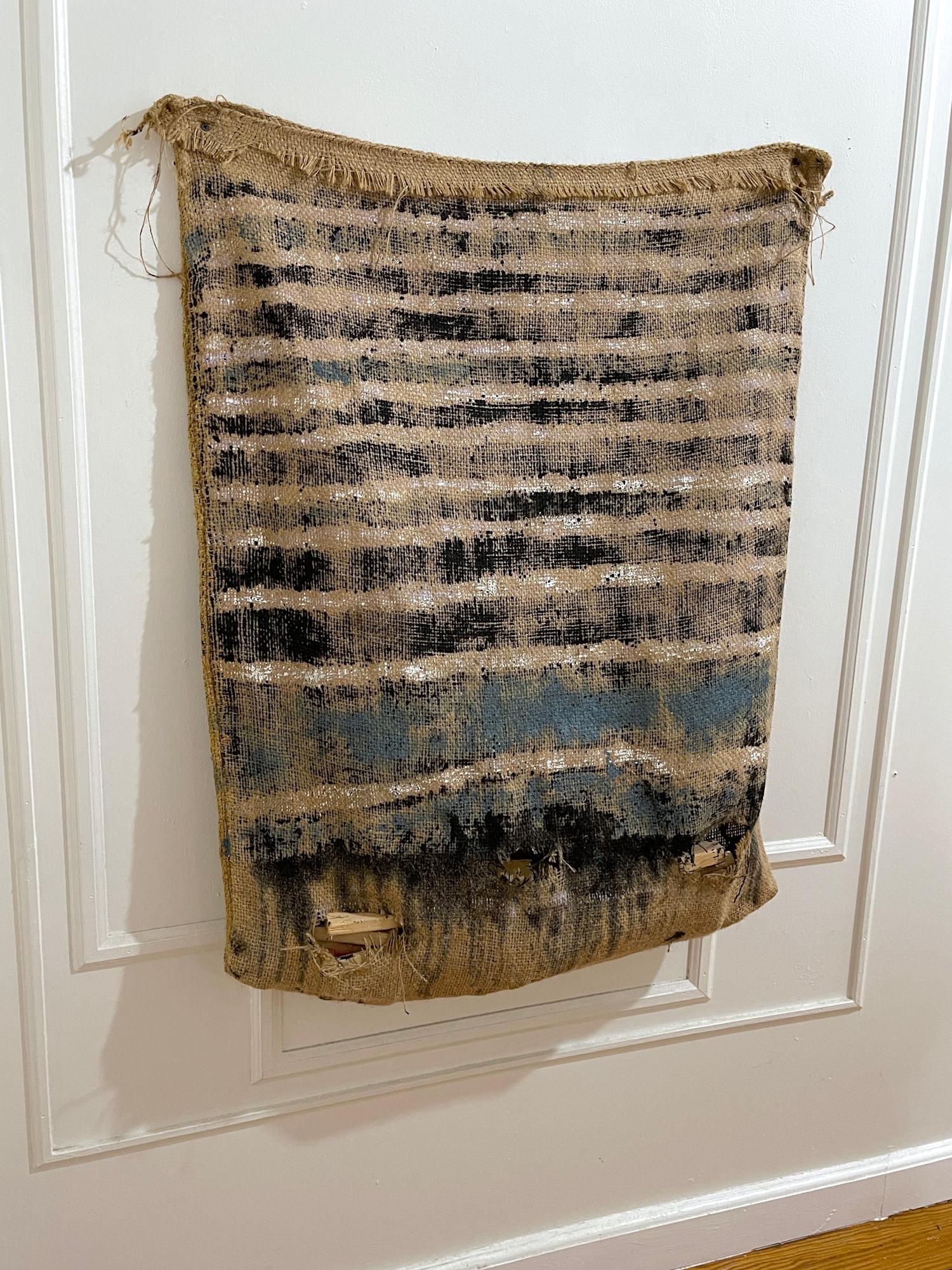 Inside-Out Burlap Bag Painting (black monochrome over stripes)