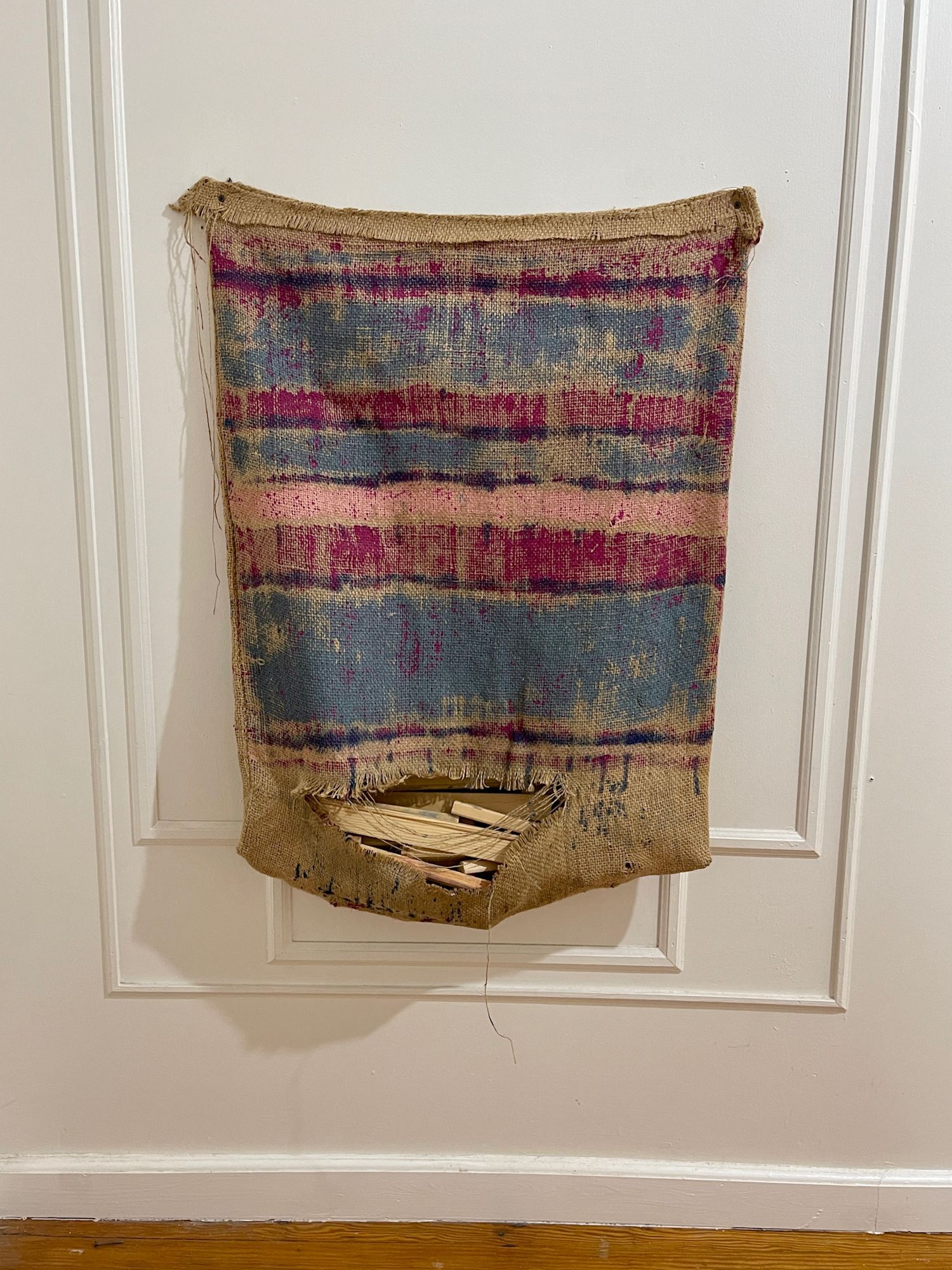Inside-Out Burlap Bag Painting (magenta monochrome over stripes)