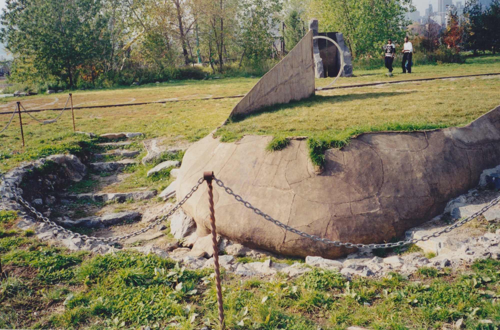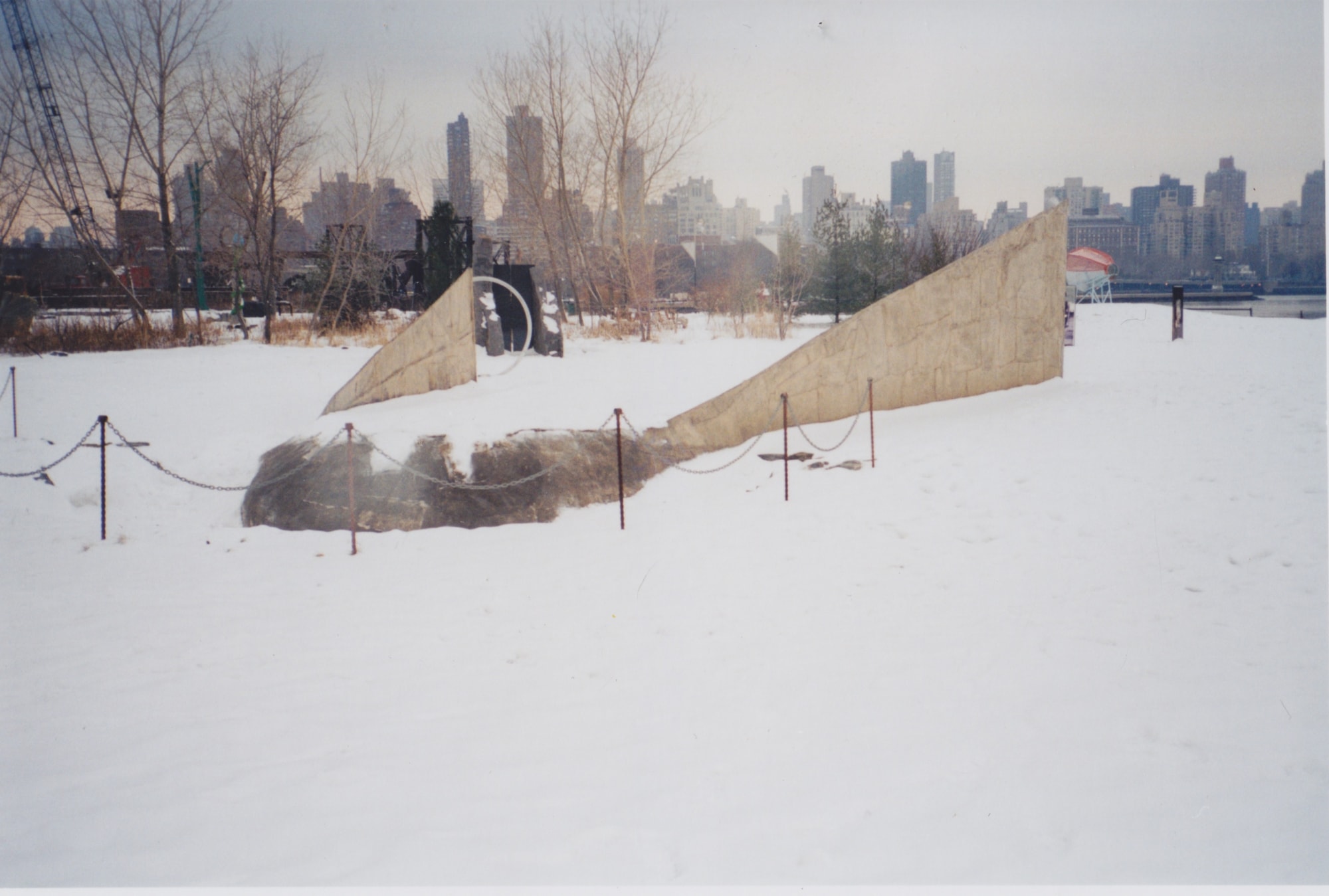 Surface is an environmental earthwork constructed at Socrates Sculpture Park in 1999-2000. Based on bulging burlap sacks of paint created in the studio, Surface uses earth to achieve the same tension and display of weight. Surface was designed to engage people in the experience of viewing the surface of the earth at eye level rather than the usual perspective from above. The work is a large, bulging, burlap sack of earth held up by two wing-like structures emerging from the ground. Surface is accessible by steps, located on each side of the structure, leading down into a moat-like space. In this area, viewers are at eye level with the plush, green surface of turf extending out into the distant landscape. Chamomile, planted along its perimeter, fills the immediate area with its aroma, as participants encounter the contained force of the earth. The work resembles a ceremonial or ritual place and has the appearance of an ancient dwelling existing in a contemporary landscape. Surface is the first of a series of earthworks dedicated to our relationship with the environment. The sequels to this work are Opposing Surfaces, Center of the Surface of the Earth and Under the Surface.