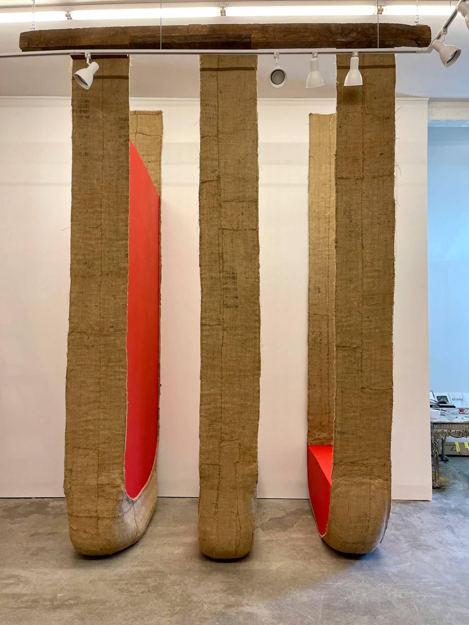 Paint, burlap, wood, qypsum board, compound, glue, hydrocal