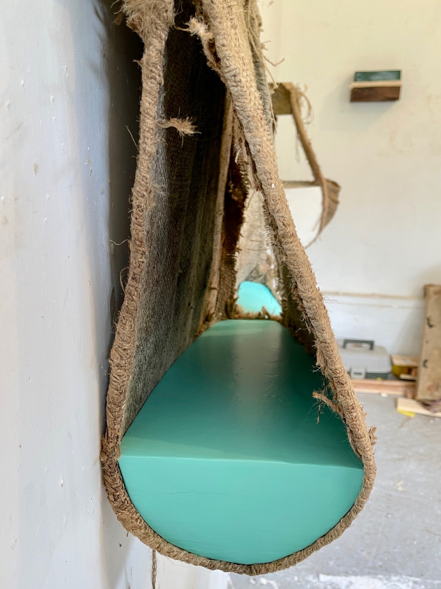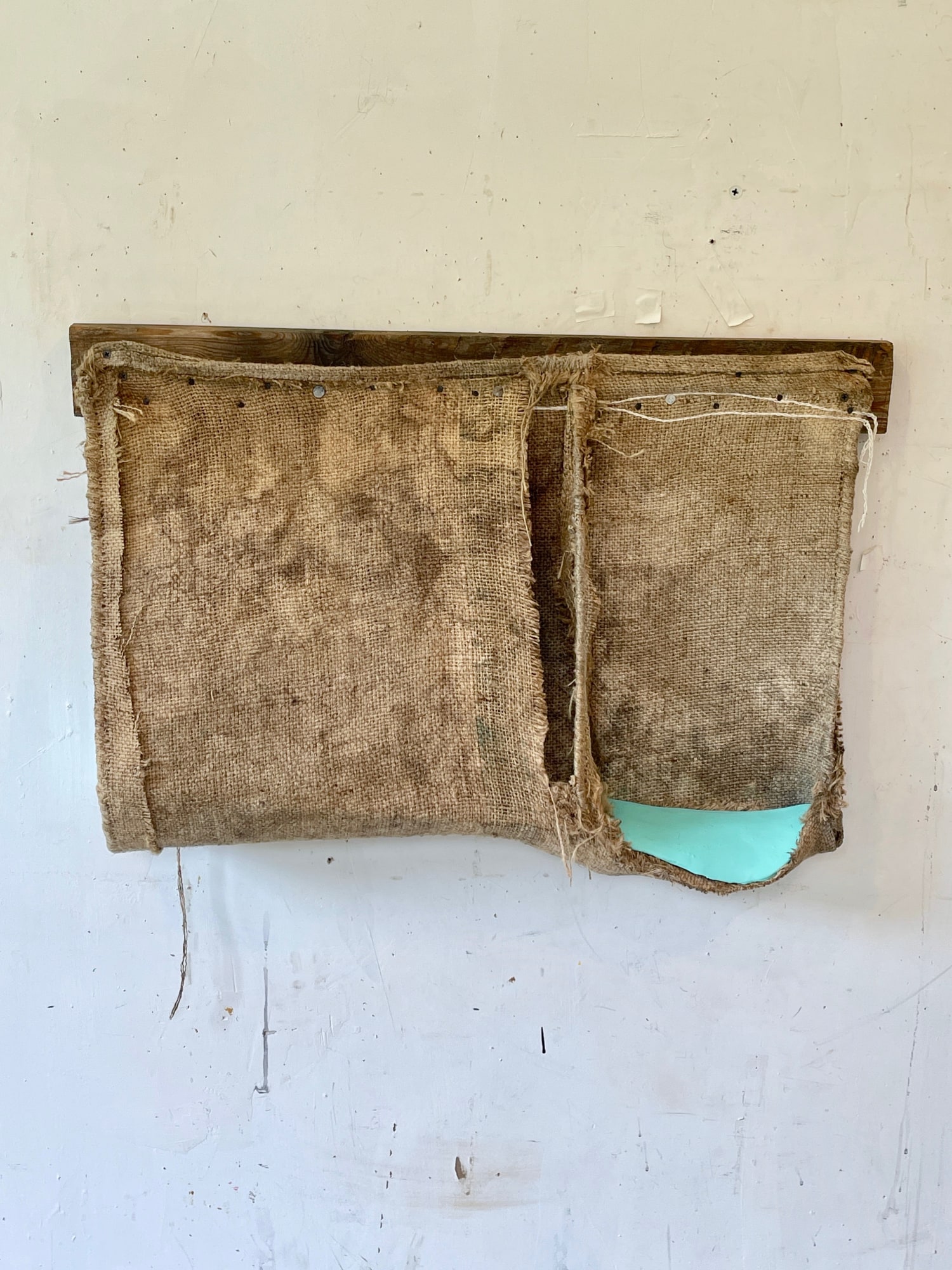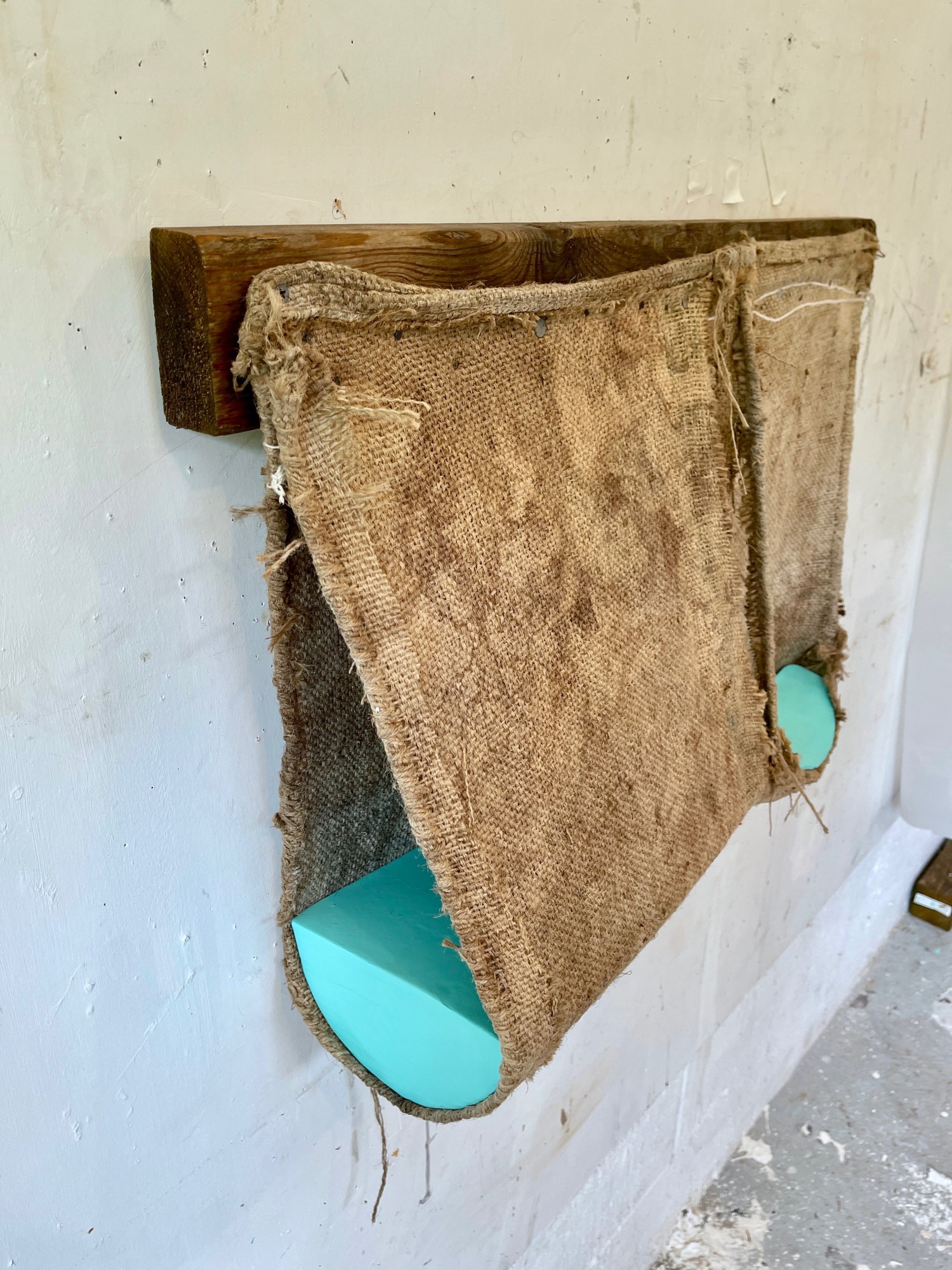 Burlap/jute, Paint, Wood, Hydrocal, Glue, and Tacks