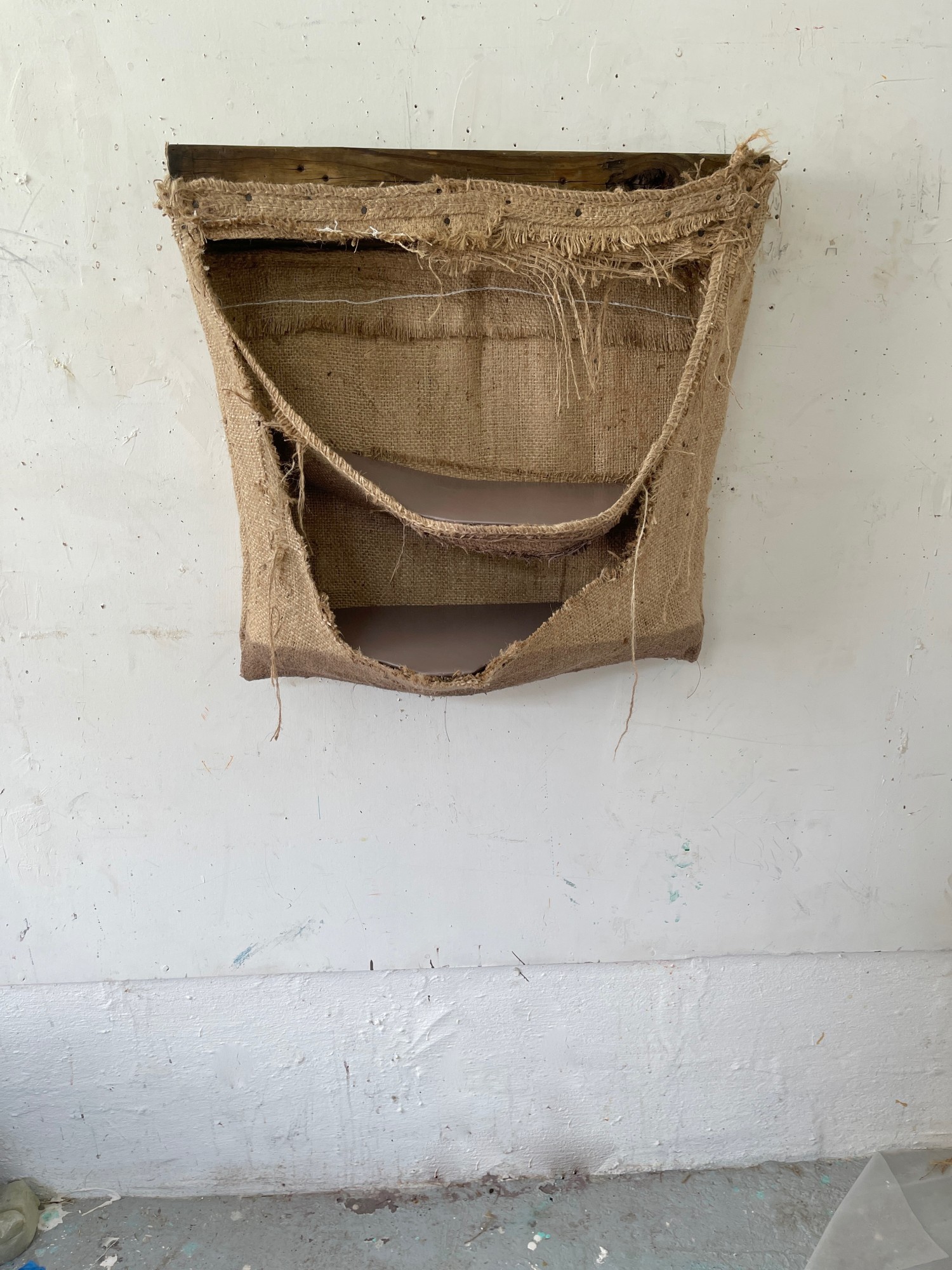 Burlap/jute, Paint, Wood, Hydrocal, Glue, and Tacks