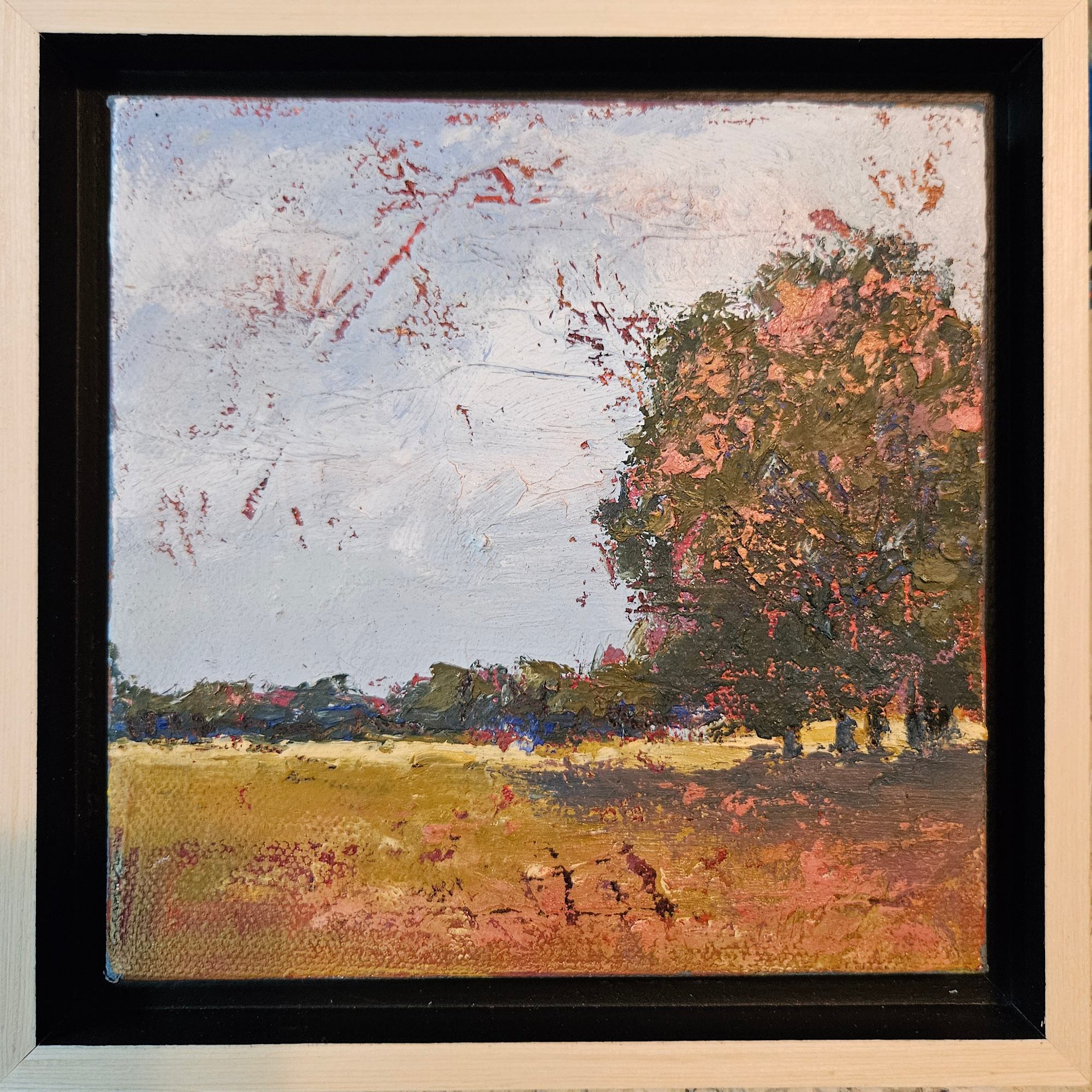 Small, 6x6 textured landscape with pops of muted coral and warm gold tones against a cool sky. Framed in natural wood floater frame.